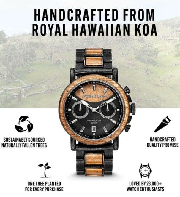 Stylish and durable chronograph watch featuring genuine Koa wood inlays and stonewashed stainless steel. Perfect mix of rugged and refined.