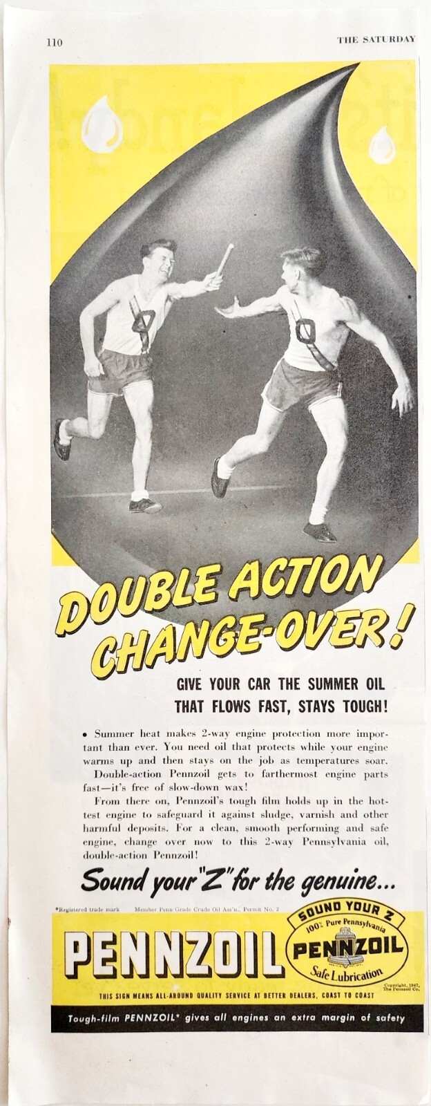 1947 Pennzoil Motor Oil Advertisement Relay Race Runners Automobilia DWWW4
