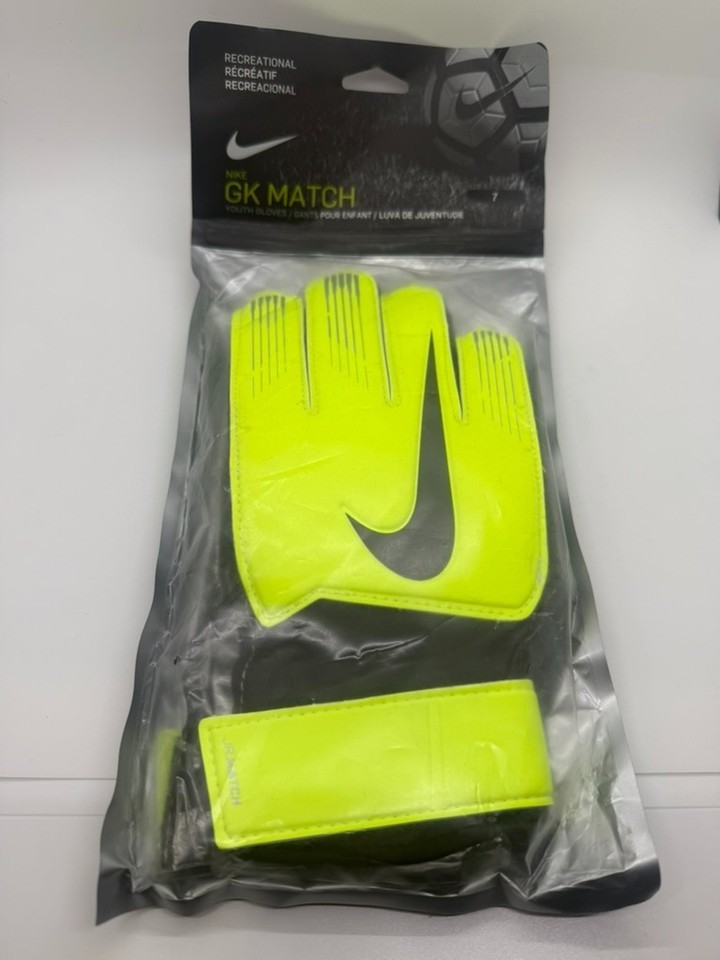 The product is a pair of brand new Nike GK Match Youth Gloves in size 7, featuring a striking yellow and black color scheme. Specifically designed for goalkeeper use in soccer, these gloves offer a slip-on cuff type and a 5-finger style for optimal performance on the field. Manufactured between 2020-2029 and with the official association of FIFA, these gloves are sure to be a high-quality and stylish addition to any young soccer player's gear collection.