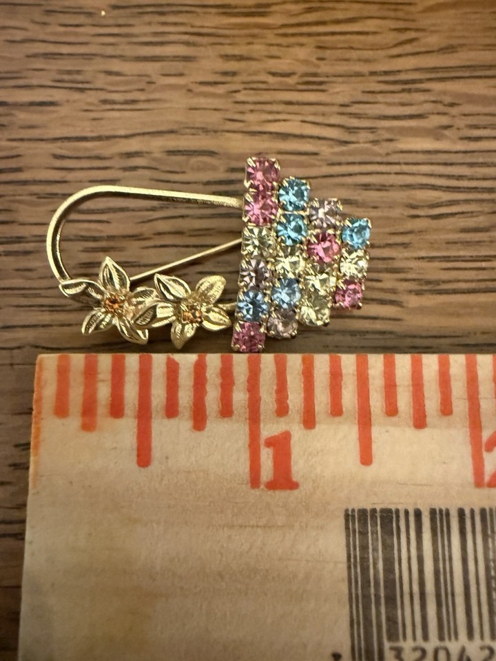 This vintage brooch features a gold tone pastel/multicolor rhinestone floral flower basket pin design. It is made of rhinestone and metal materials. Perfect for those who appreciate retro jewelry, this unique piece adds a touch of vintage charm to any outfit with its intricate floral design and colorful rhinestones.