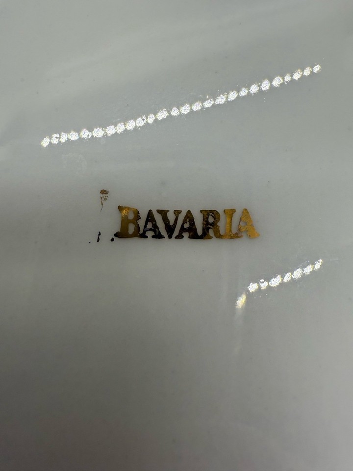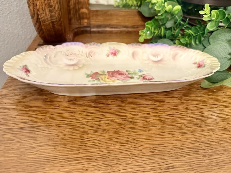 This elegant vintage porcelain tray from Bavaria features a classic scalloped rim with embossed details, accented by delicate rose floral sprays in soft pinks, yellow, and lavender. Based on the simple ?Bavaria? backstamp on the underside and the style of the floral transfer, this tray likely dates from the early 1900s to the 1930s, a period when Bavarian porcelain was widely exported to the U.S. and Europe. Measuring 13 inches long, this versatile piece works beautifully as a dresser vanity tray, bread or relish dish, or simply as a decorative accent.