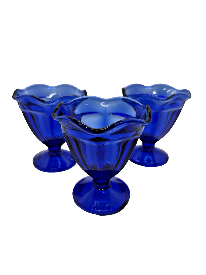 This set of 3 vintage Anchor Hocking cobalt blue footed dessert sundae dishes is a charming addition to any table setting. Made in the USA during the 1960s, these sherbet sundae dishes feature a glossy finish and are crafted from high-quality glass. The cobalt blue color adds a pop of vibrancy to your table, while the footed design adds a touch of elegance. Whether you're serving up delicious desserts or appetizers, these dishes are sure to impress your guests and elevate your dining experience.