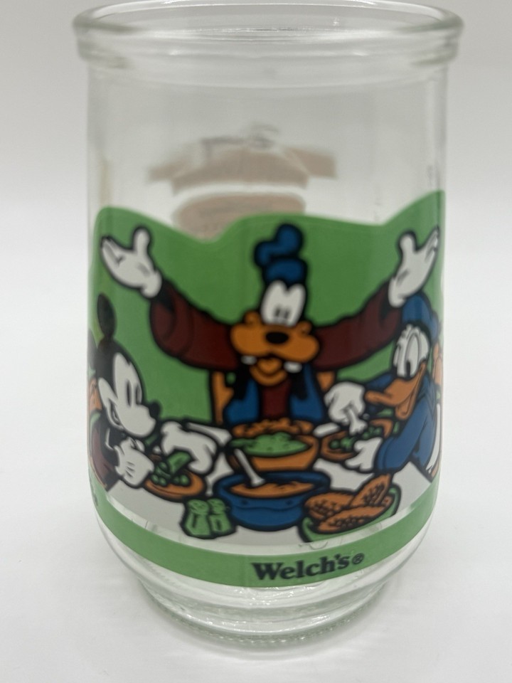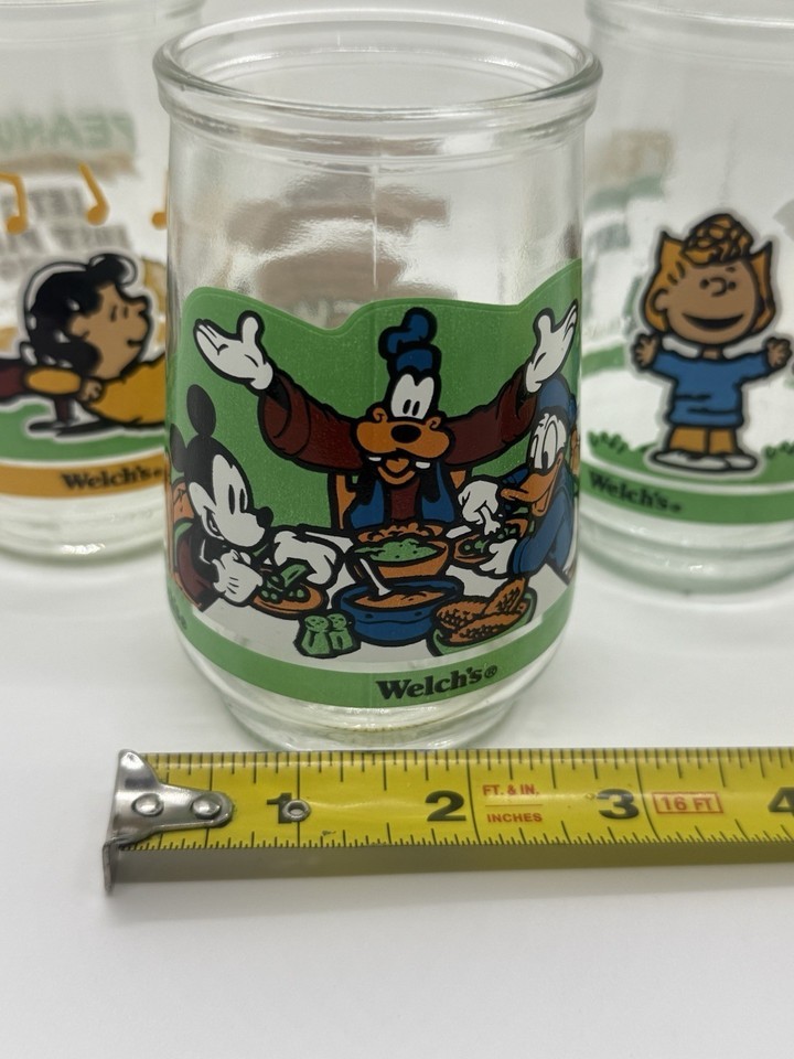 This is a set of 3 vintage Welch's glass jelly jars featuring two Peanuts themed glasses and one Disney Mickey themed. The Peanuts glasses features Lucy and Schroeder with his piano along with Charlie Brown and Sally flying a kite. The Disney glass features Goofy hosting dinner for Mickey Mouse and Donald Duck. These colorful jars are original advertising pieces from the United States and are in great condition with bright colors and no chips (see photos). The glasses are stamped with the numbers 2, 21, and 23 respectively. The jars are a unique collectible item that would make a great addition to any vintage memorabilia or advertising collection.