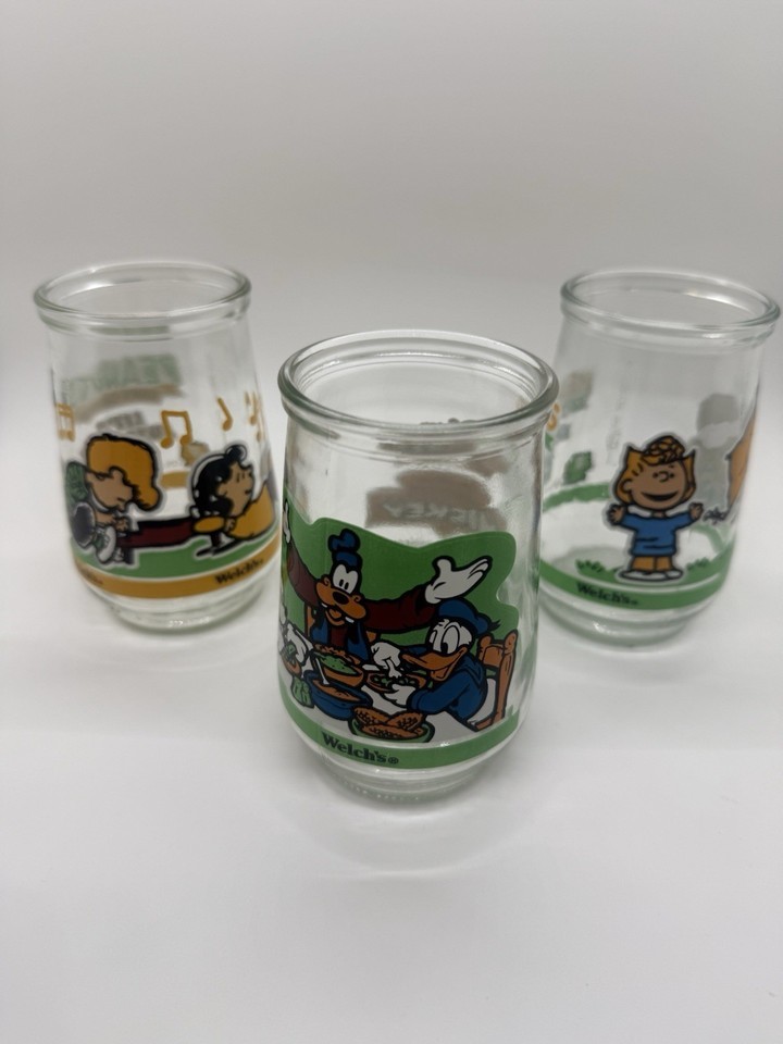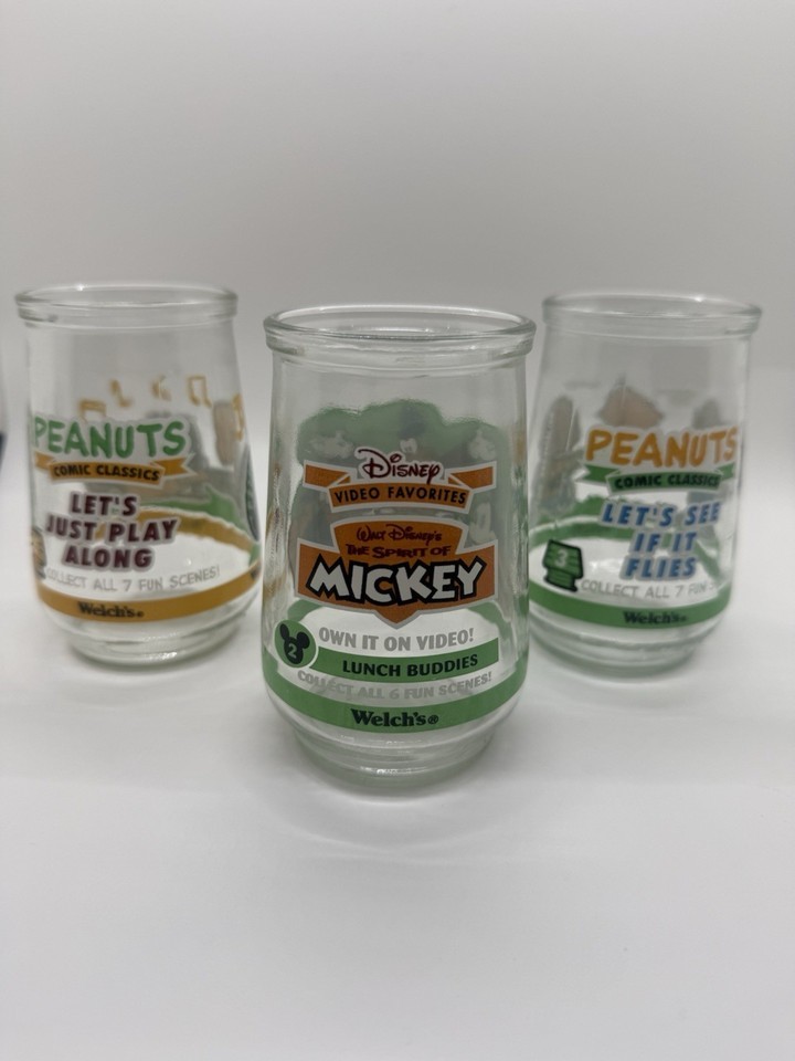 Set Of 3-Vintage Welchs Glass Jelly Jars Mixed - Peanuts Disney Mickey