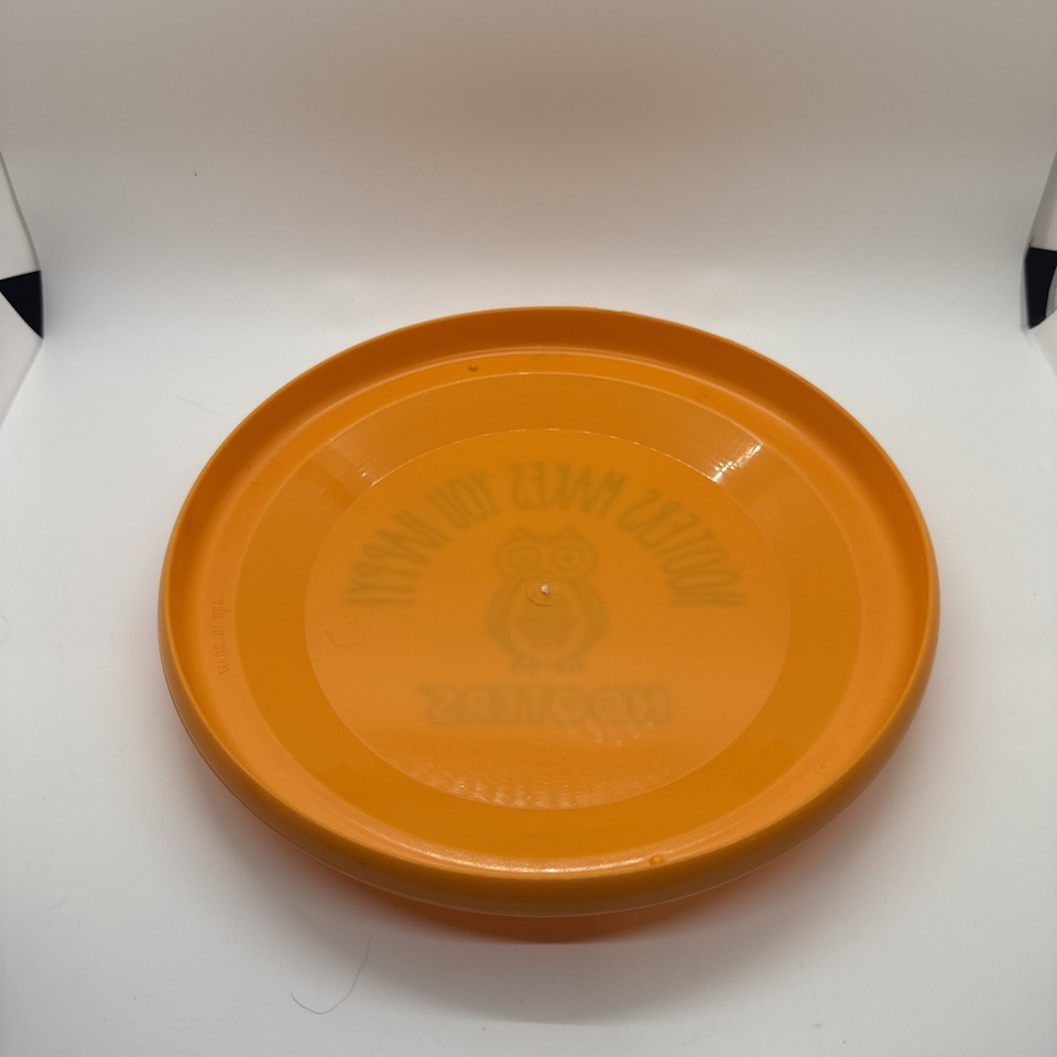 The Hooters Flying Disc Frisbee is a 9" orange vinyl owl designed for playing disc golf or frisbee with a unique twist - the brand is Hooters, known for their spicy chicken restaurant chain. Made of durable plastic, this flying disc allows for fun and interactive play outdoors or at the beach. Its vibrant orange color and playful owl design make it a standout choice for those looking to add a bit of personality to their frisbee collection.
