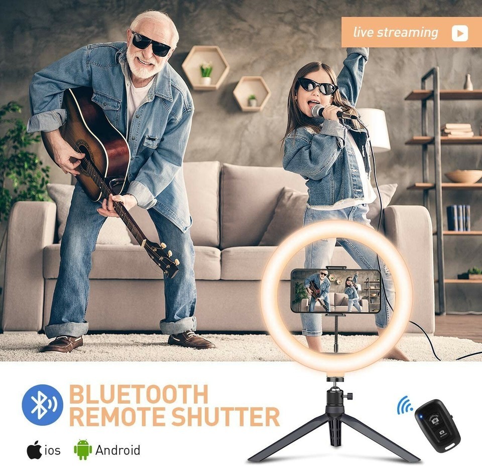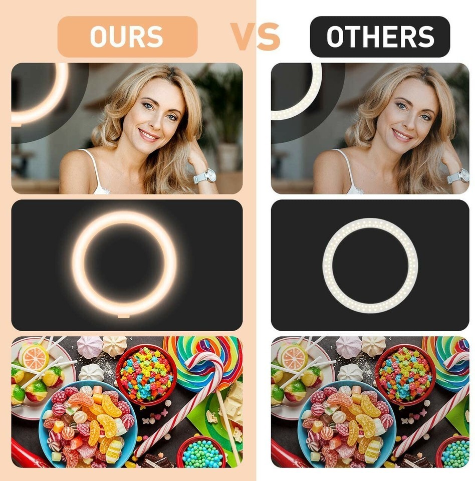 10.2" Dimmable Ring Light: 3 colors lighting mode: Soft White, Natural Light, Warm Light Each lighting mode has 10 adjustable brightness. Allowing you to have a light environment that suits any makeup /photography/live broadcasting/Youtube/Tik Tok video and video recordings