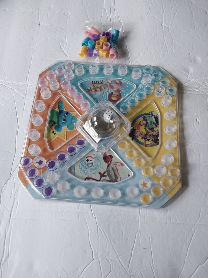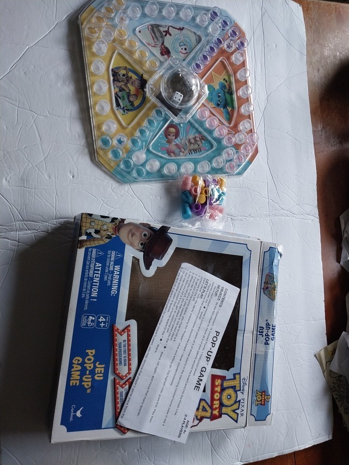 Get ready for hours of fun with this Disney/Pixar Trouble Jeu board game featuring characters from Toy Story 4! This game is perfect for 2-4 players and recommended for children ages 4 and up. The colorful game board pops up for easy setup and storage, making it great for travel or family game night.