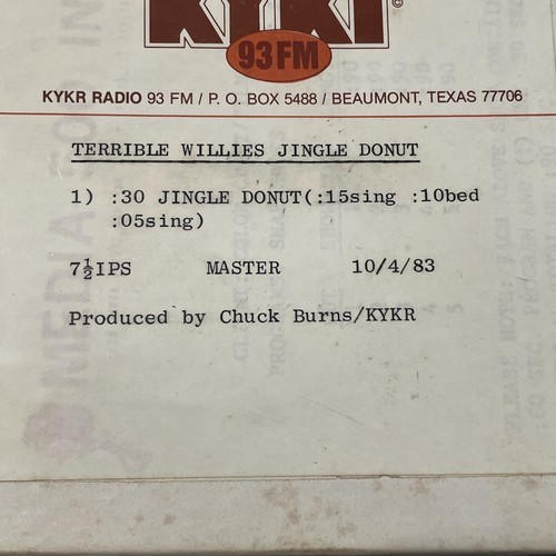 Reel To Reel Radio Commercial Terrible Willies jingle donut kykr 93fm Texas