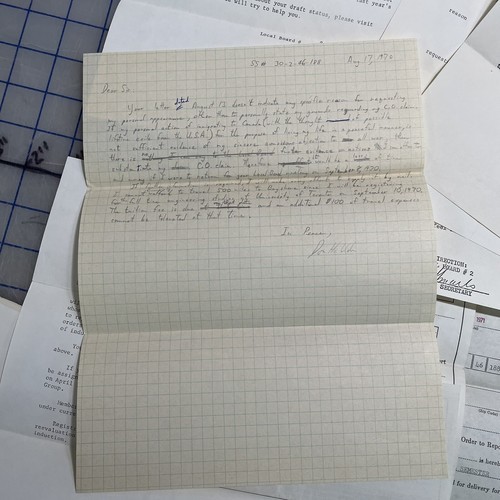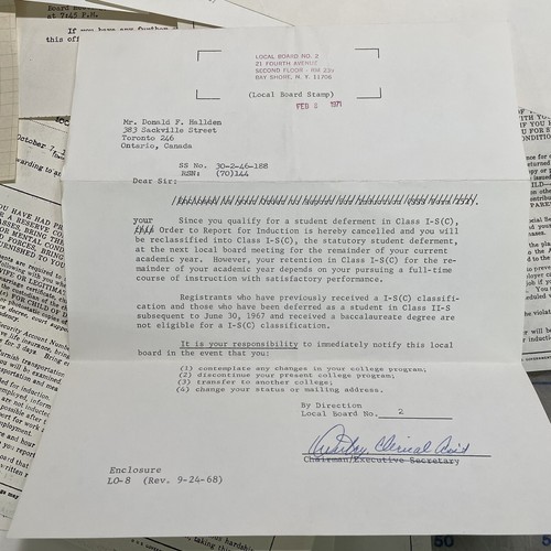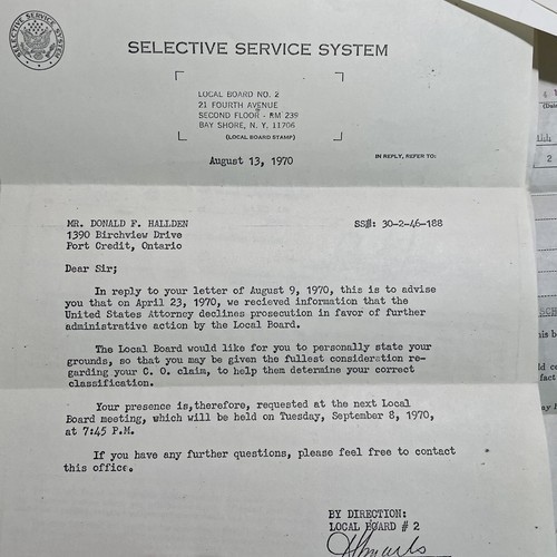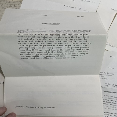 The man was a conscientious objector and includes a hand written letter to the Selective Service on that subject and explaining he will soon be a student in Canada.