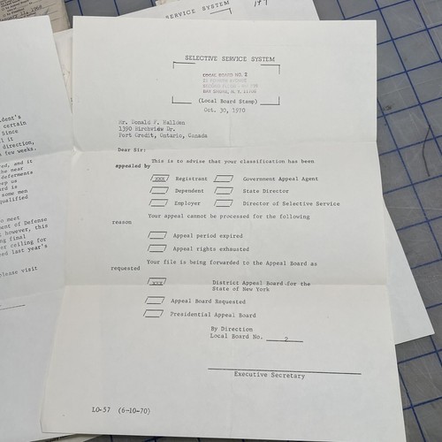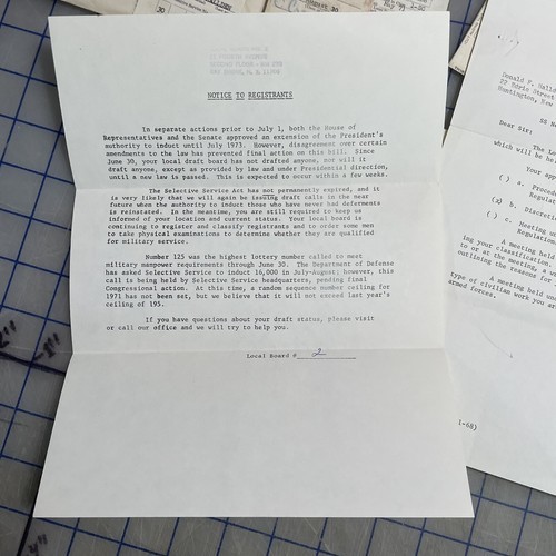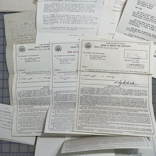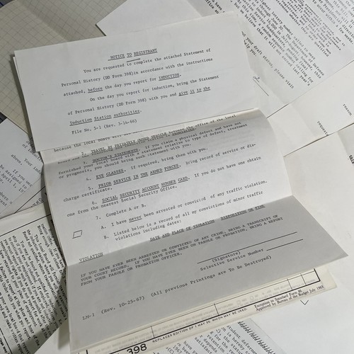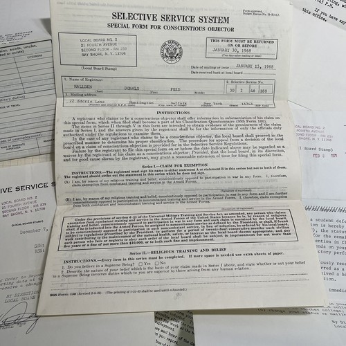 This selection of ephemera is one man?s record of his selective service paperwork, including letters sent to him in New York and Canada as well as numerous draft cards beginning 1964.