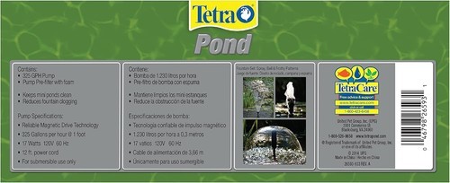 Tetra Pond FK5 Filtration Fountain Kit is ideal for small to mid-size preformed ponds from 50-250 gallons. Fountain assembly includes three fountain heads (frothy, spray, and bell pattern), swivel adjuster for leveling fountain heads, and diverter assembly. Submersible flat box filter keeps pond clean and reduces pump and fountain clogging. Flat box filter includes a coarse and fine pad, along with tubing and fitting for pump connection. The submersible pump pushes 325 gallons per hour at 1 foot. 12 foot cord. UL listed.