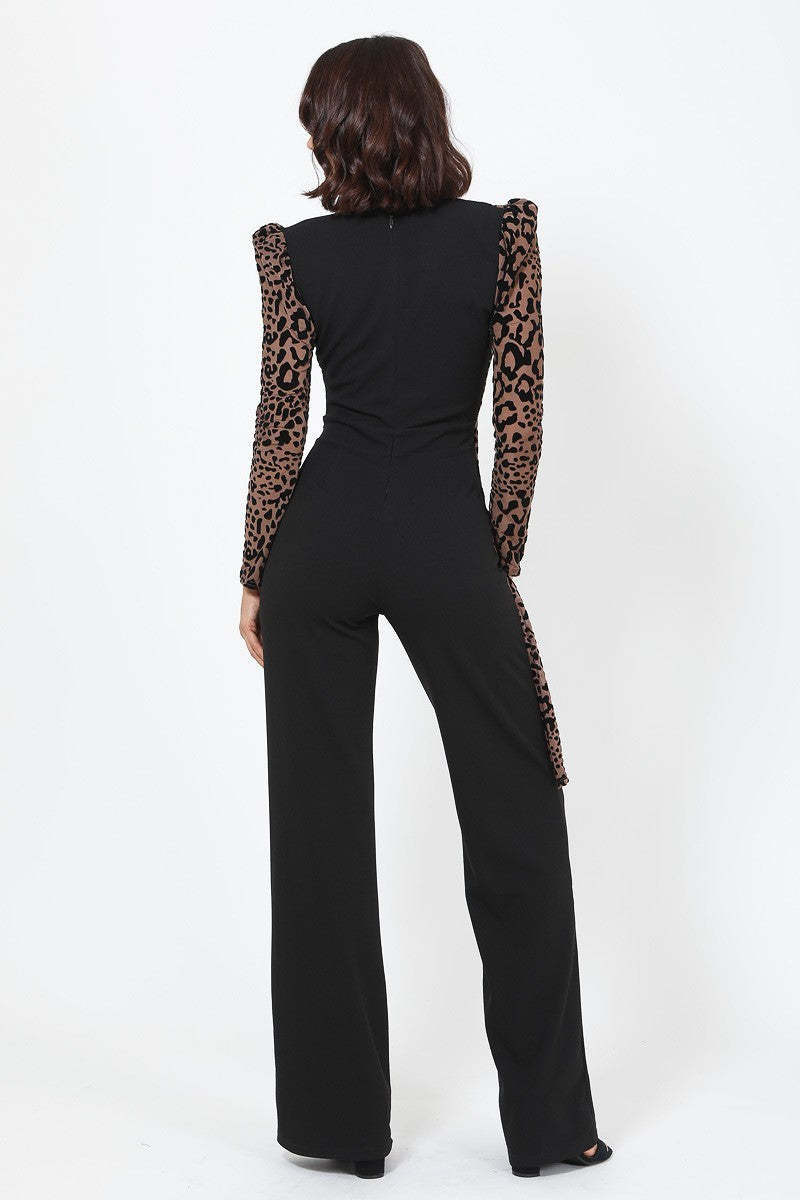 Plunging V Buckle Detail Leopard Jumpsuit.??Cute Long Puff Sleeve, Faux Calf Hair Buckle.??Flared Leg Design, Zipper on Back
