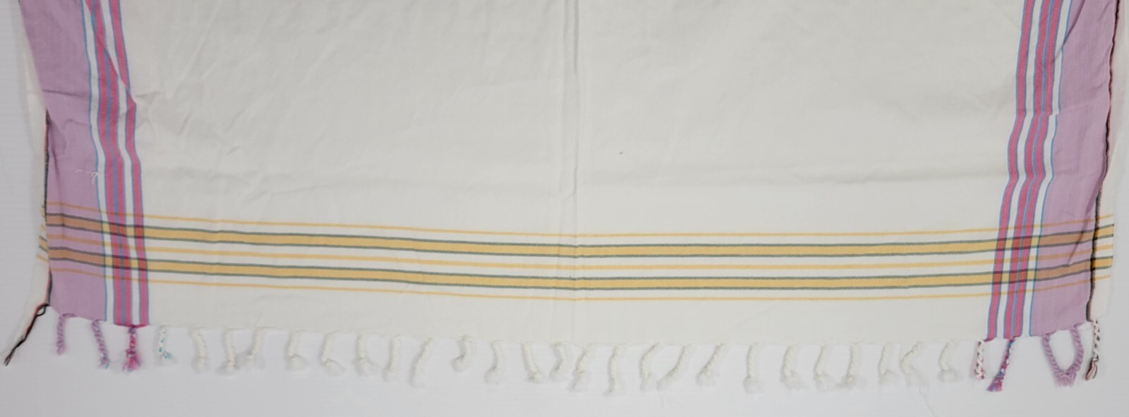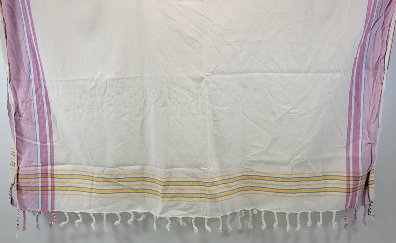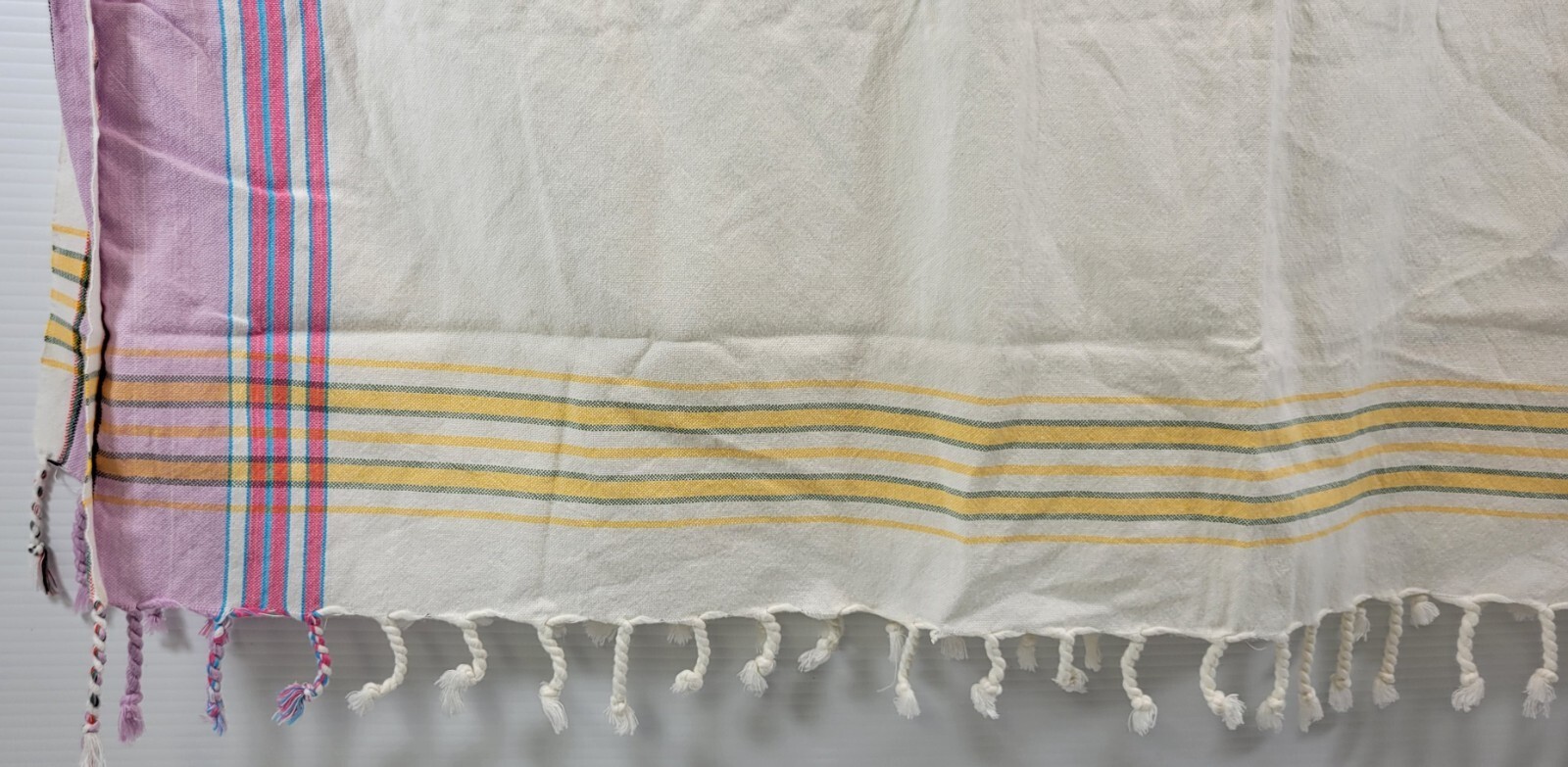 Tablecloth is in vintage used condition with possible signs of age, use and years of storage. One of the tassels has become unbraided.