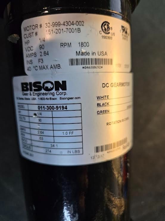 Bison 011-300-9194 DC Gearmotor 1/4HP 90VDC 53RPM 34:1 274in-lbs NEW RARE $999
