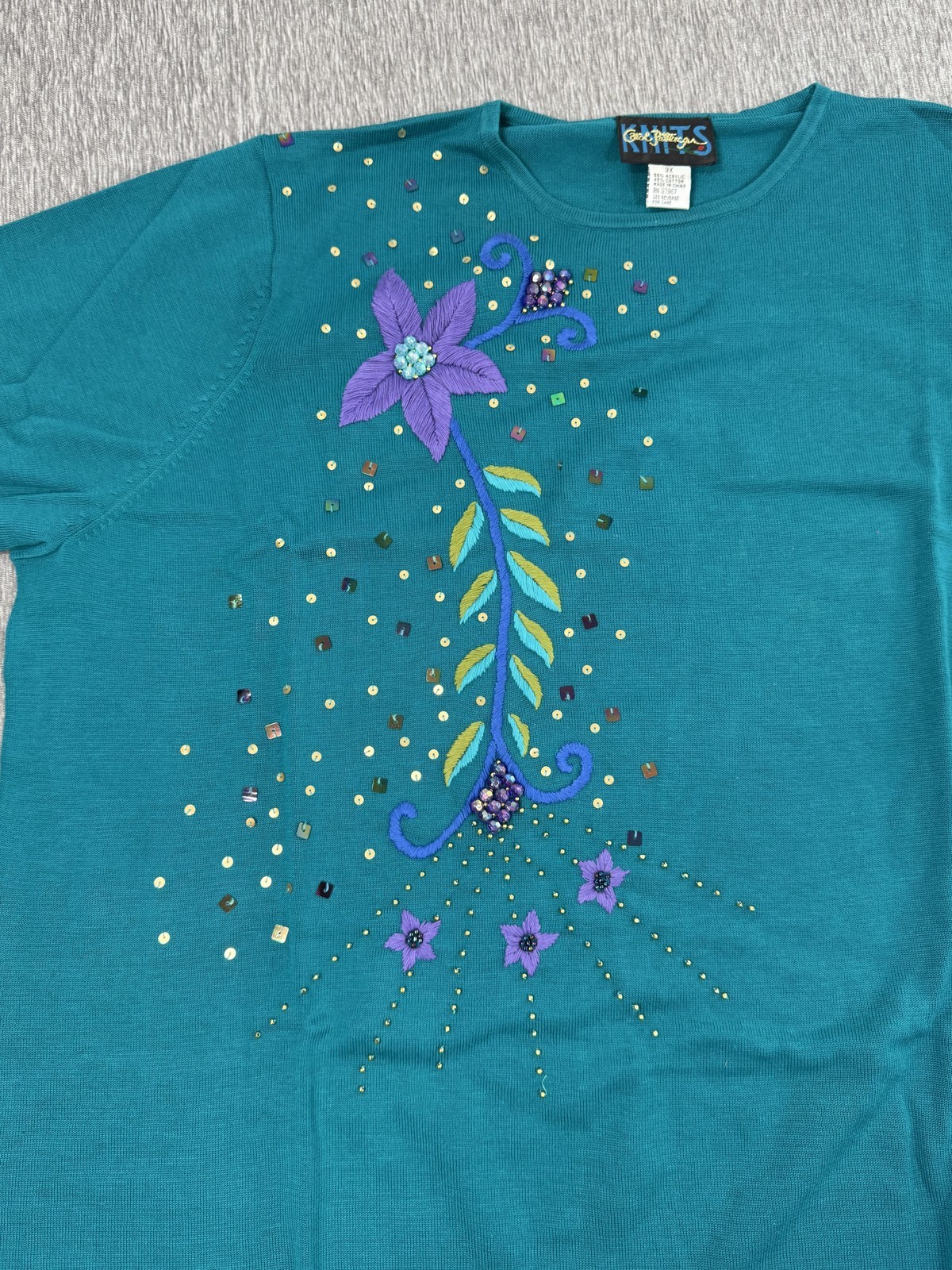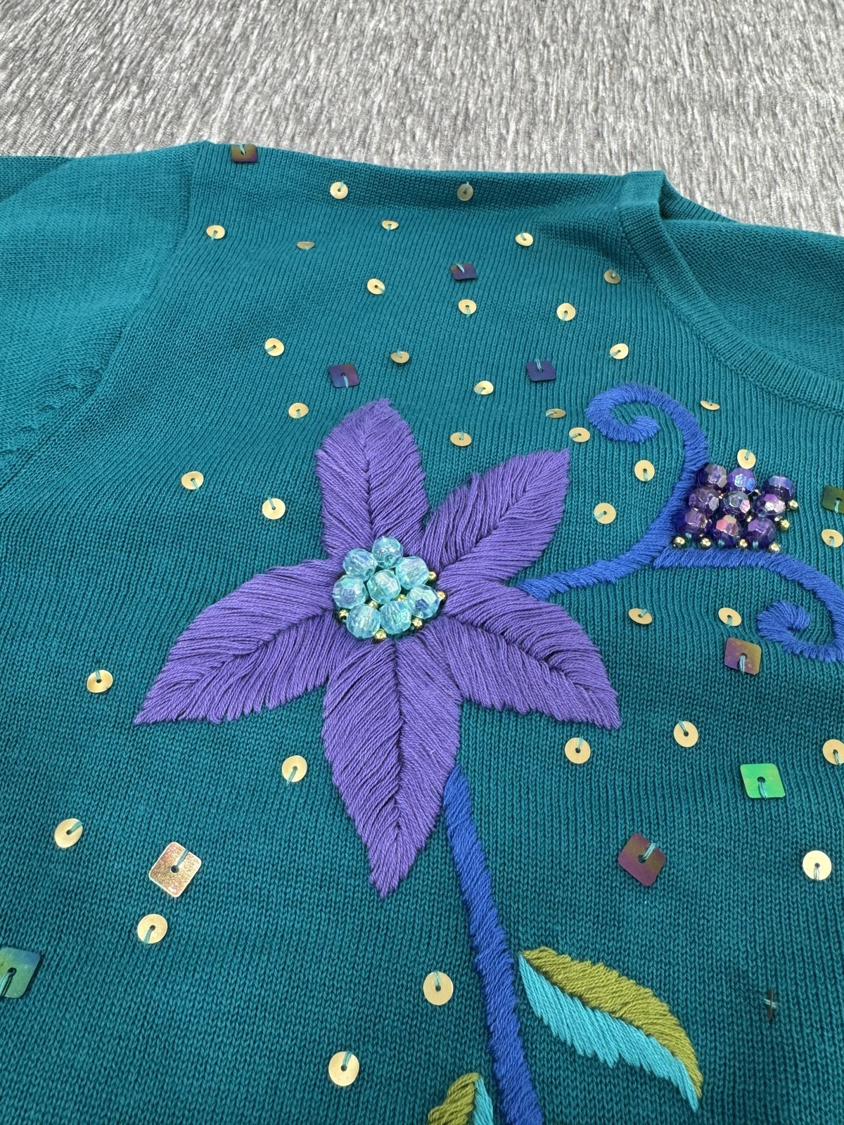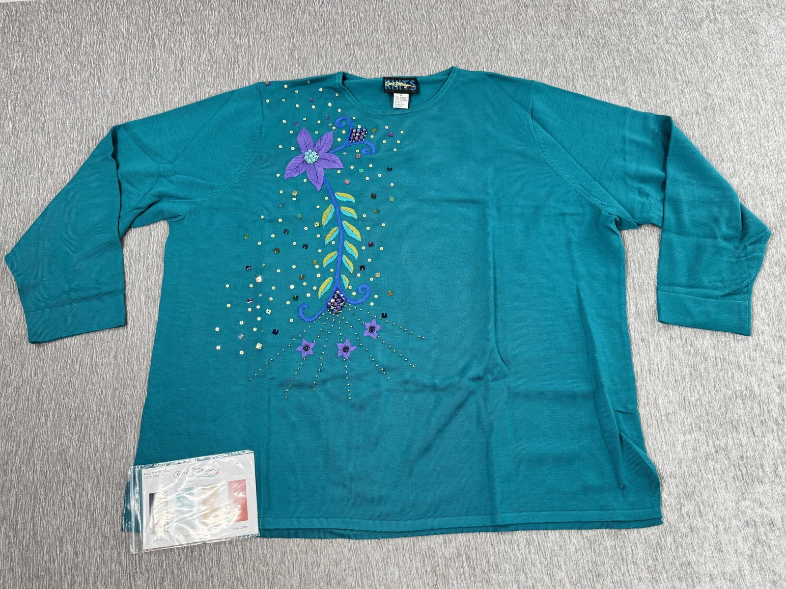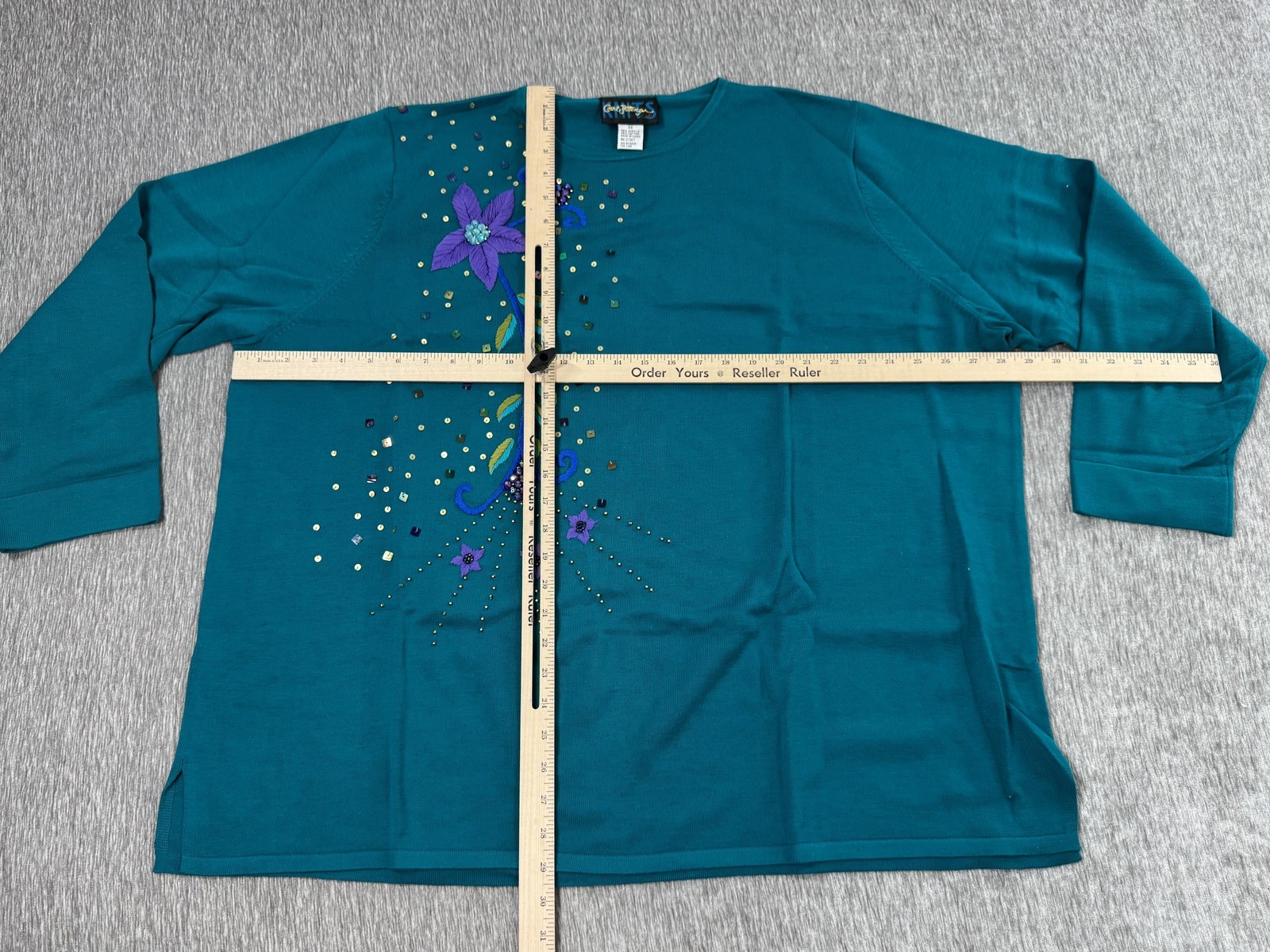Vintage Carol Patterson Knits Sweater Womens 3X Plus Teal Embroidered Beaded