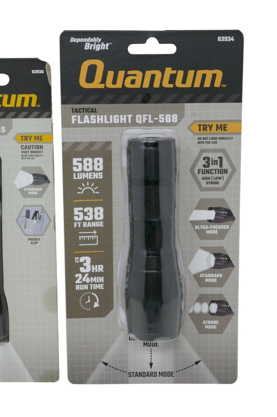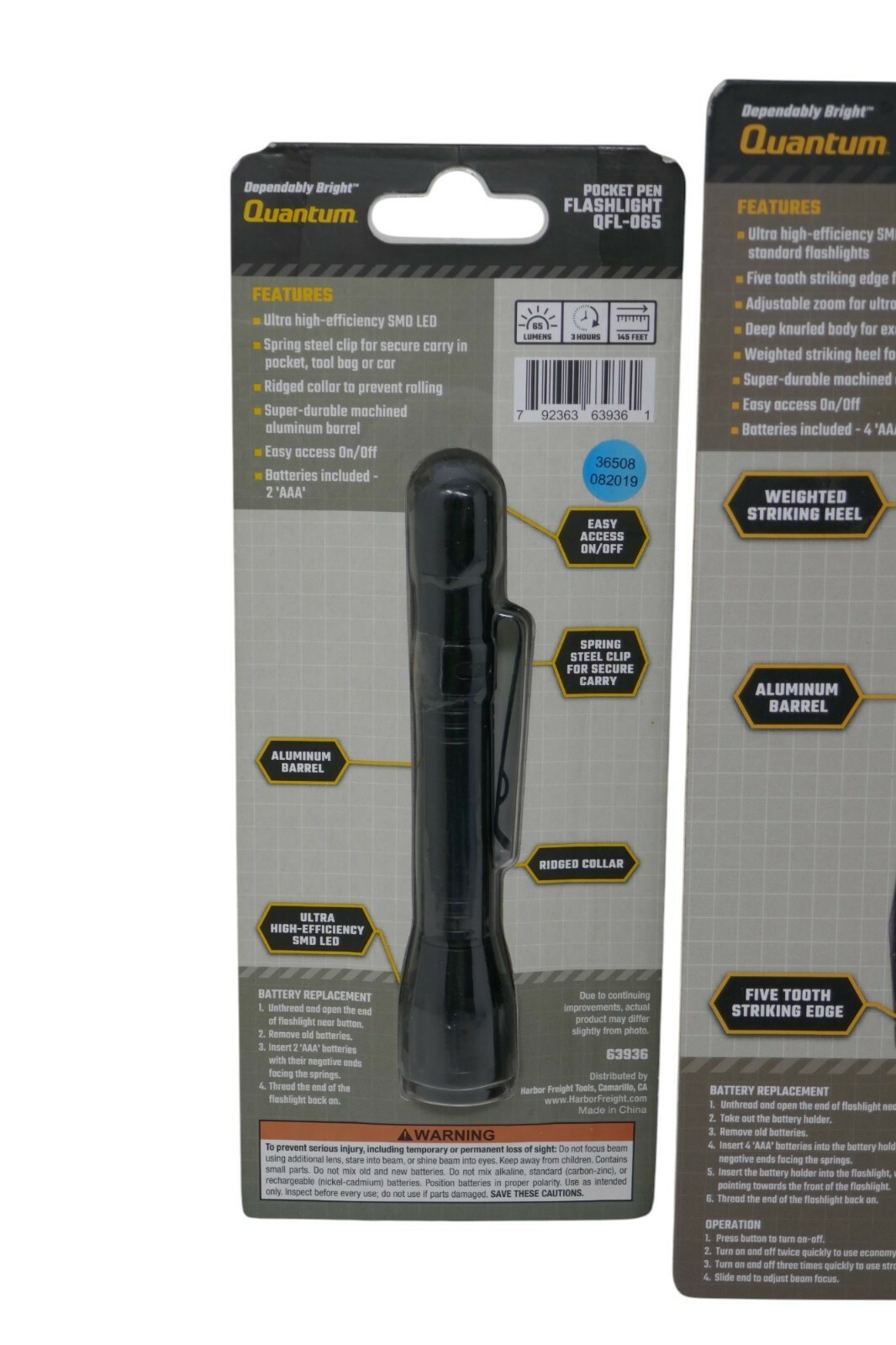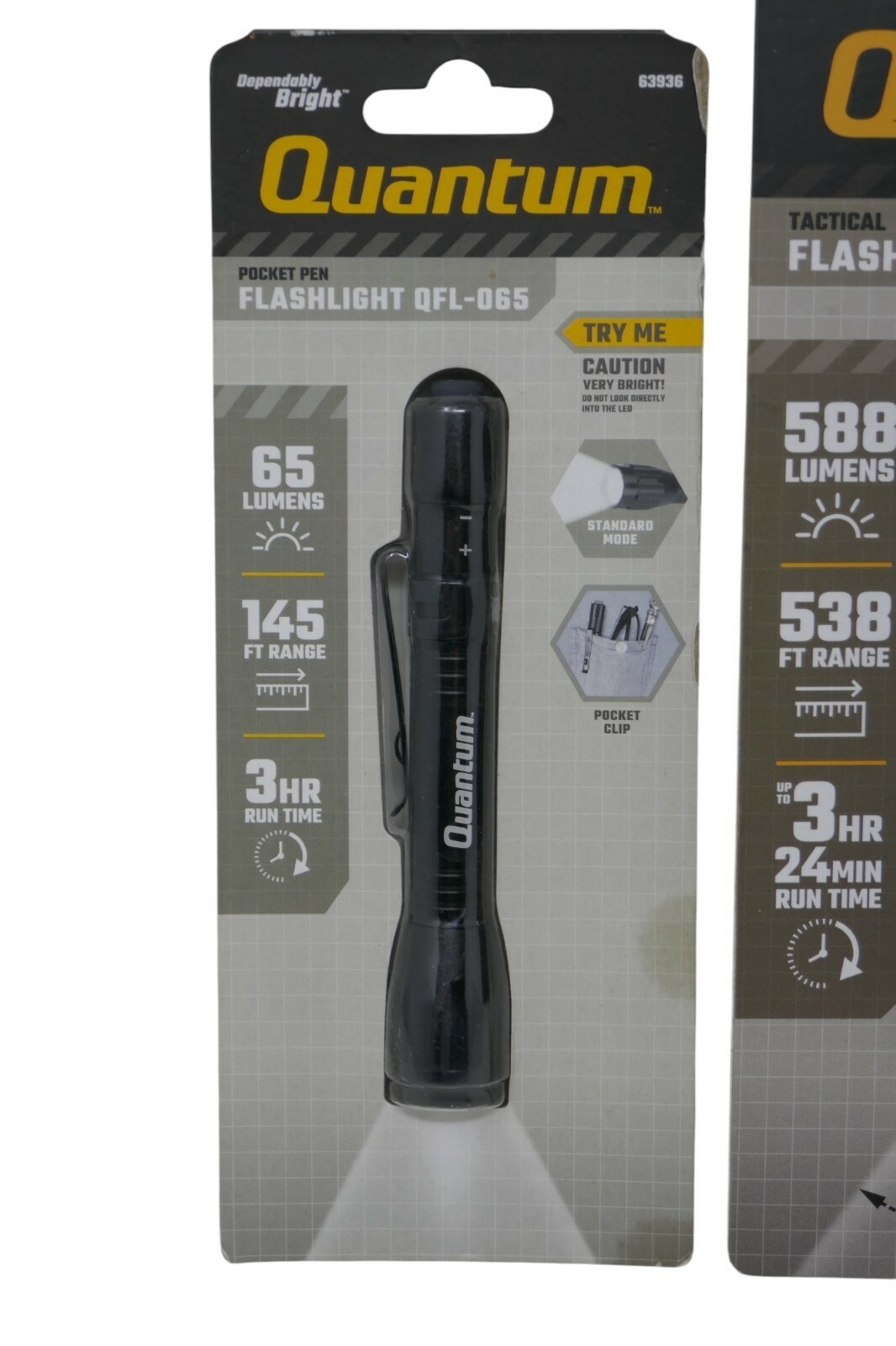 The QuantumTactical Flashlight QFL-588 and Pocket Pen Flashlight QFL-065 are high-quality, durable flashlights made of aluminum. The QFL-588 has an operating range of 538 ft and provides 1-3 lights, while the QFL-065 is compact and easy to carry in a pocket. The sleek black design and LED lighting technology make these flashlights ideal for camping, hiking, and other outdoor activities. The Quantum brand ensures reliability and performance in various situations.