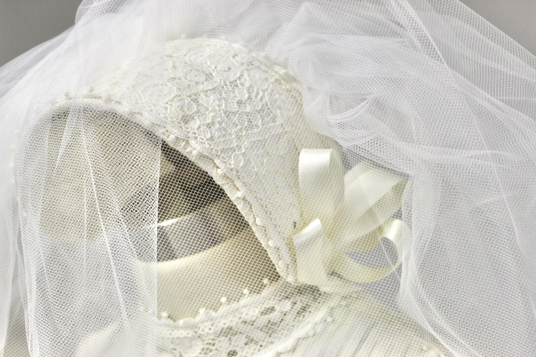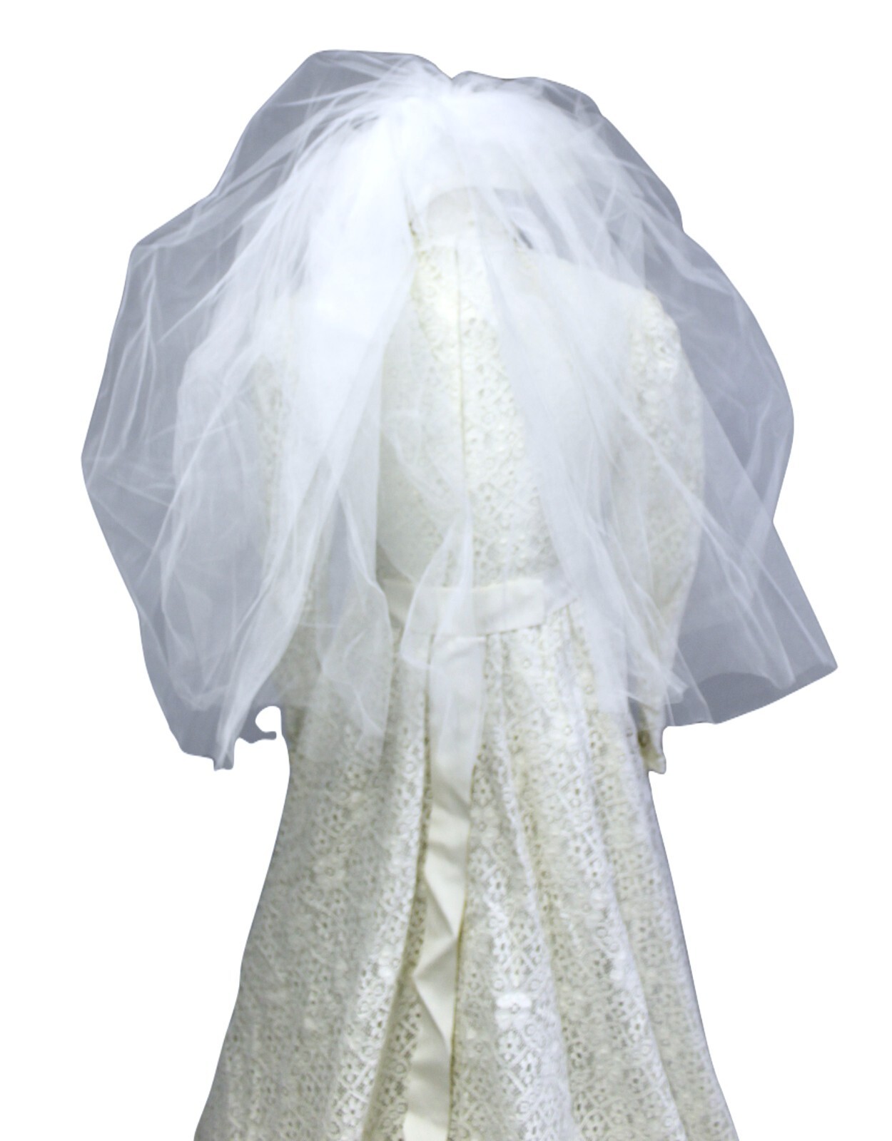 Veil is 27" long from where it attaches to headpiece, garter belt (10" around unstretched), lace handkerchief (11" square), lace drawstring bag (9"x 10")