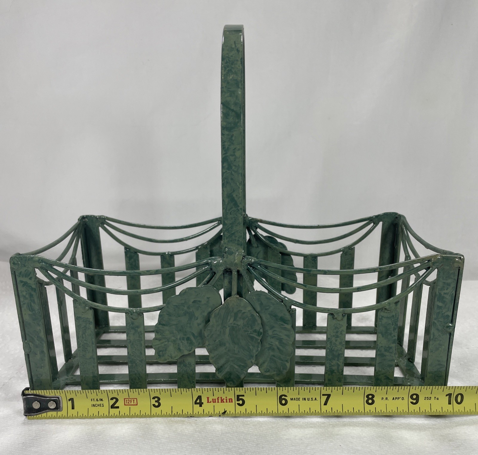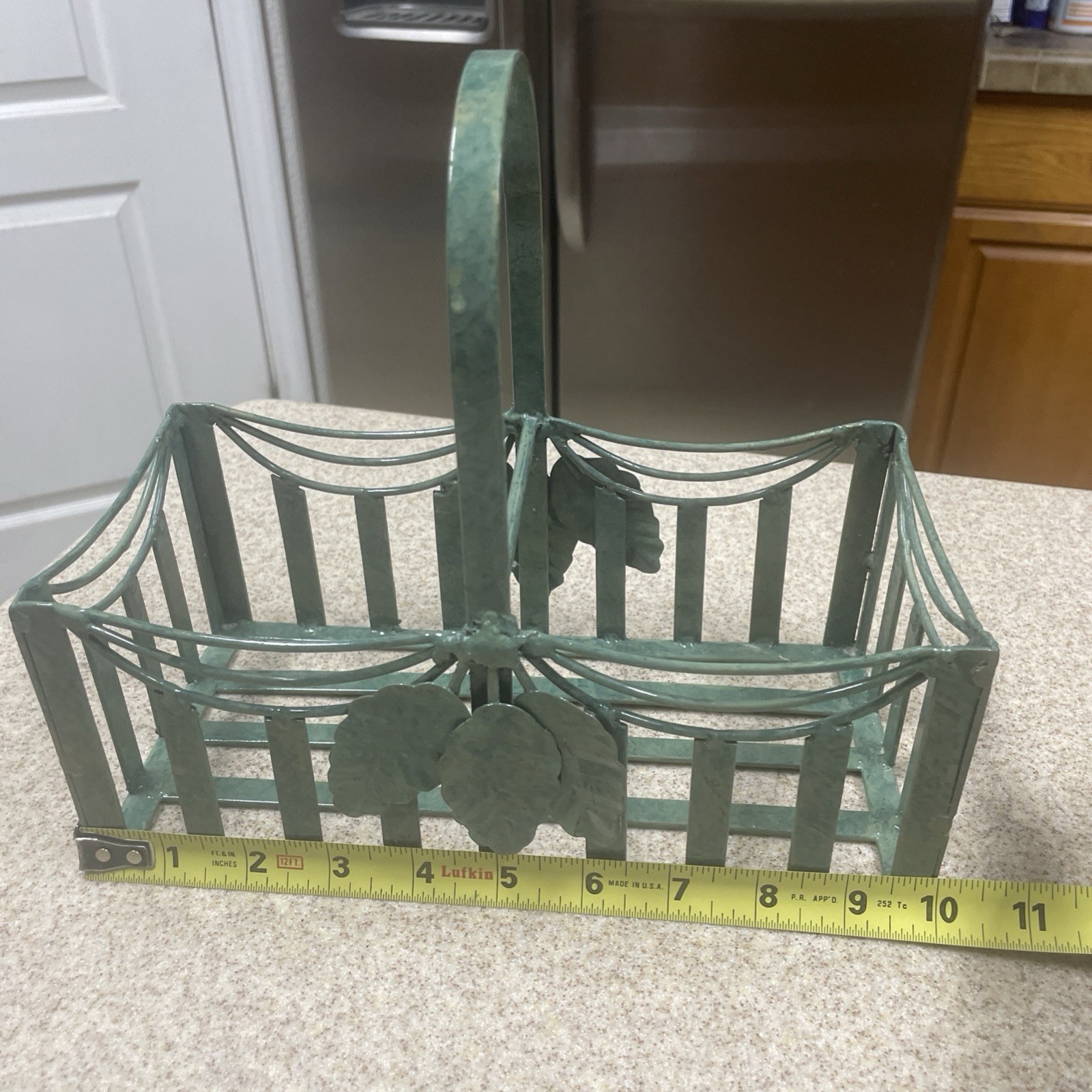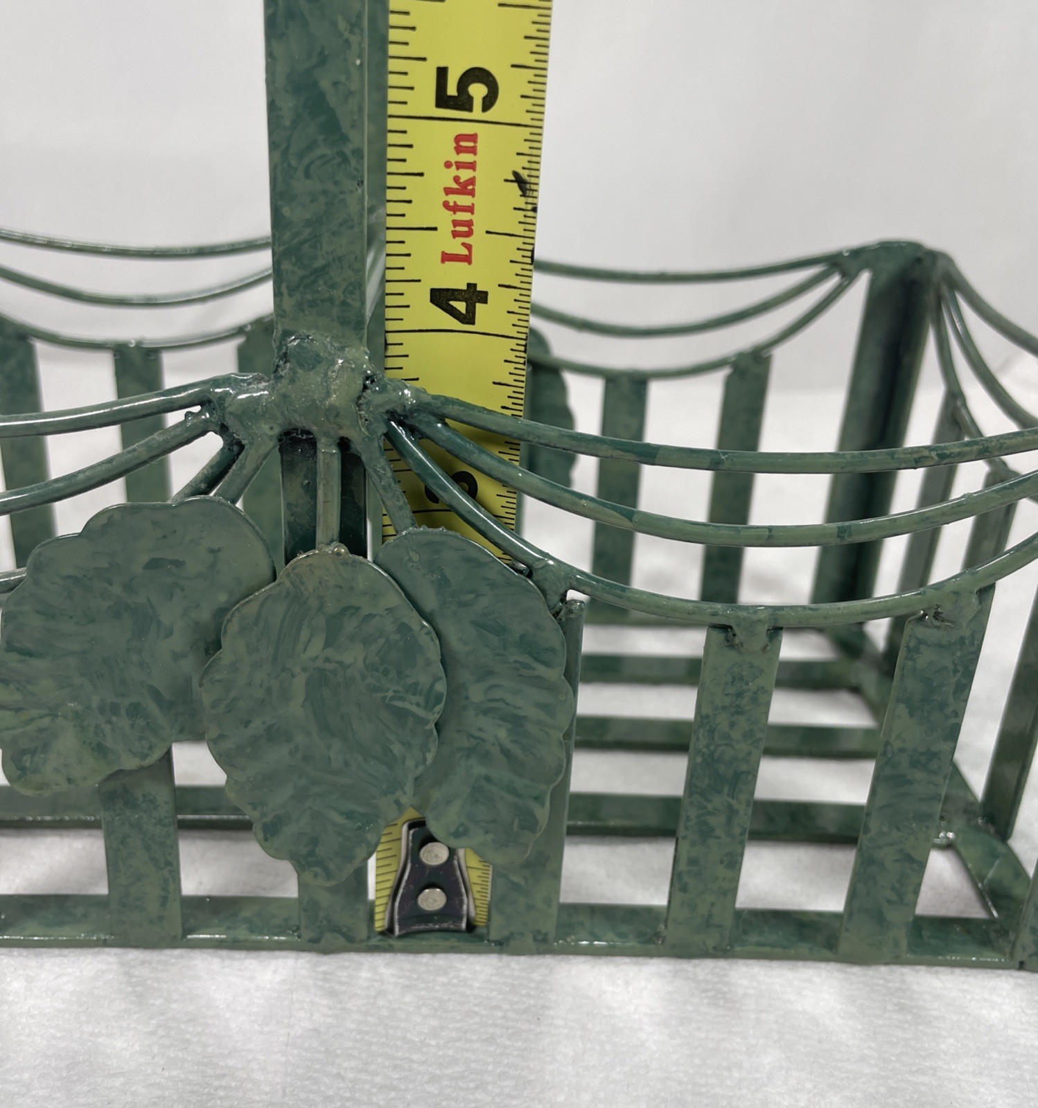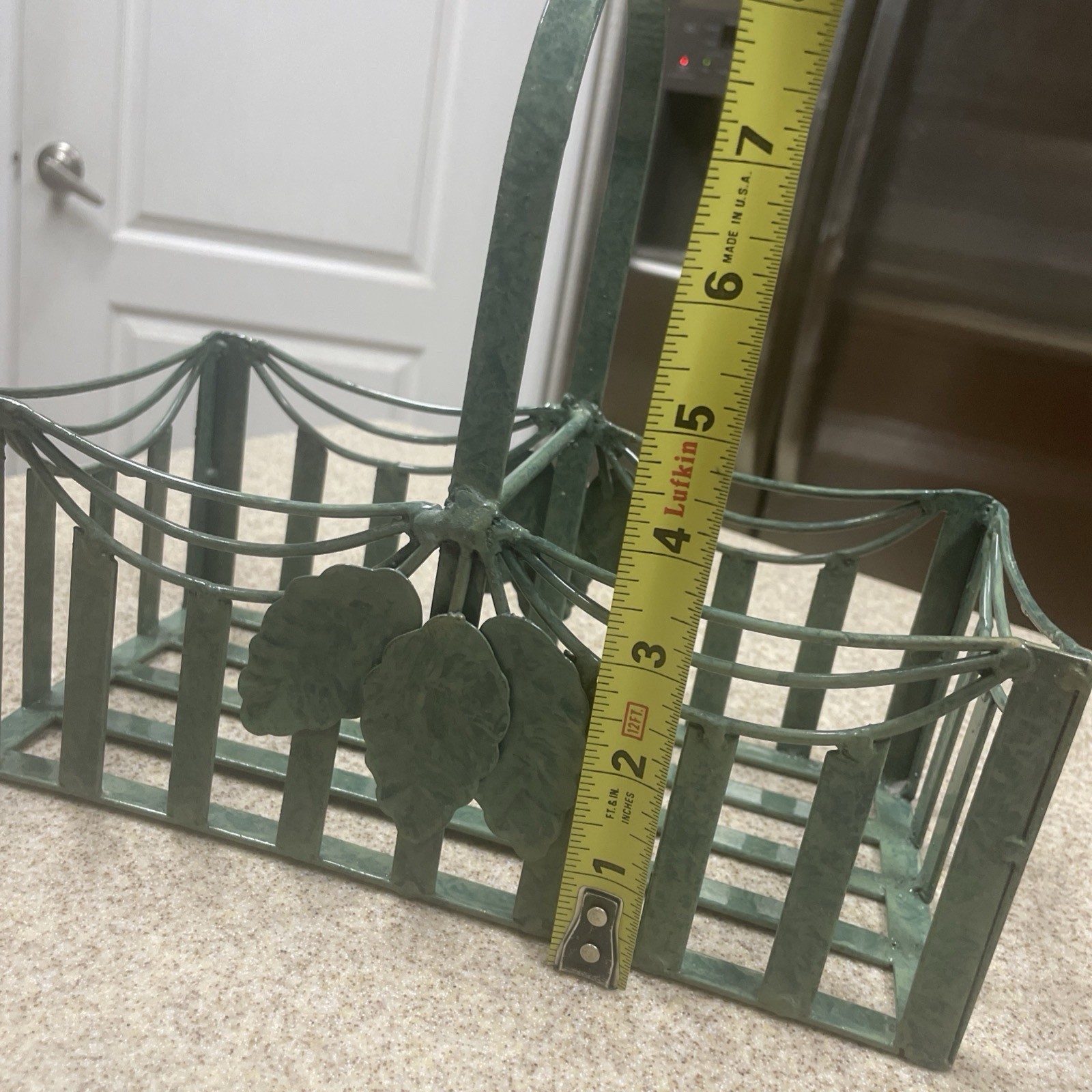 This product is a vintage decorative metal basket featuring intricate grape leaf designs. The basket stands at 9 inches tall and is rectangular in shape. It is crafted from light green metal with a country style, making it a charming addition to any home decor. Additionally, the basket comes with a handle for easy transport and display. Perfect for holding fruits or eggs in a unique and rustic way.