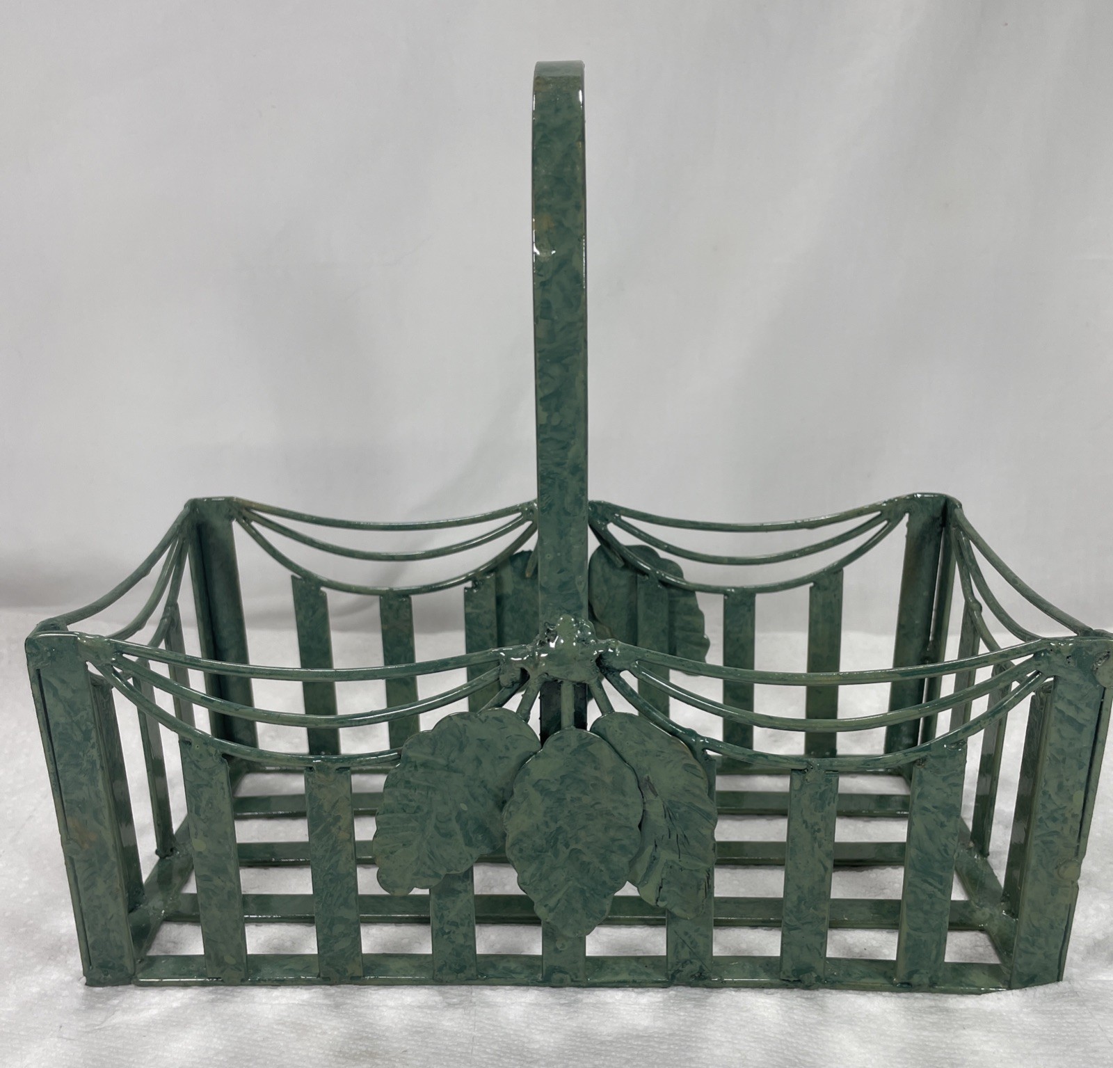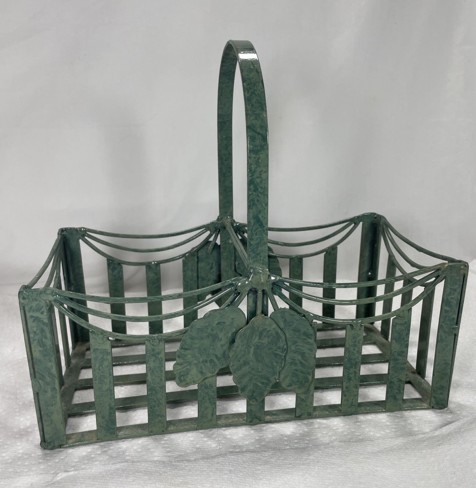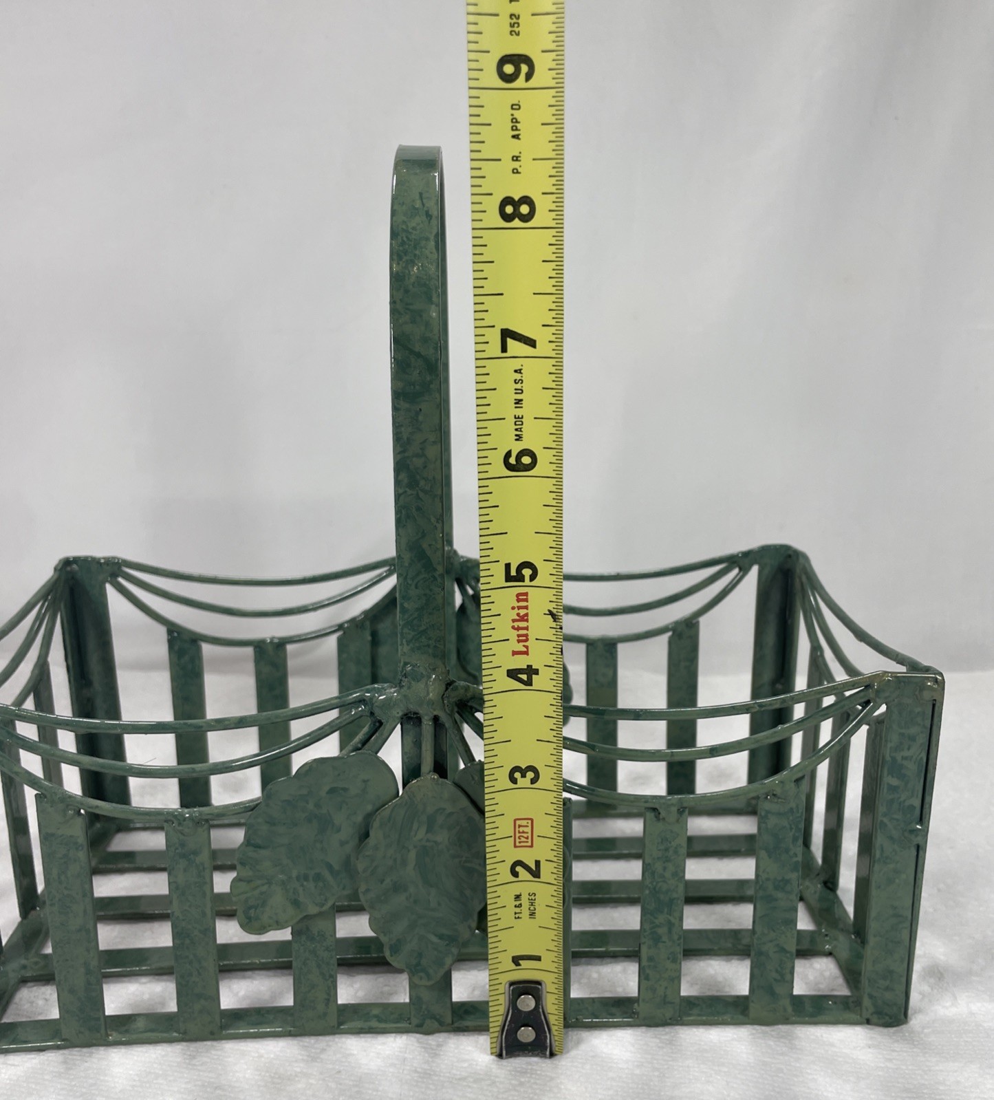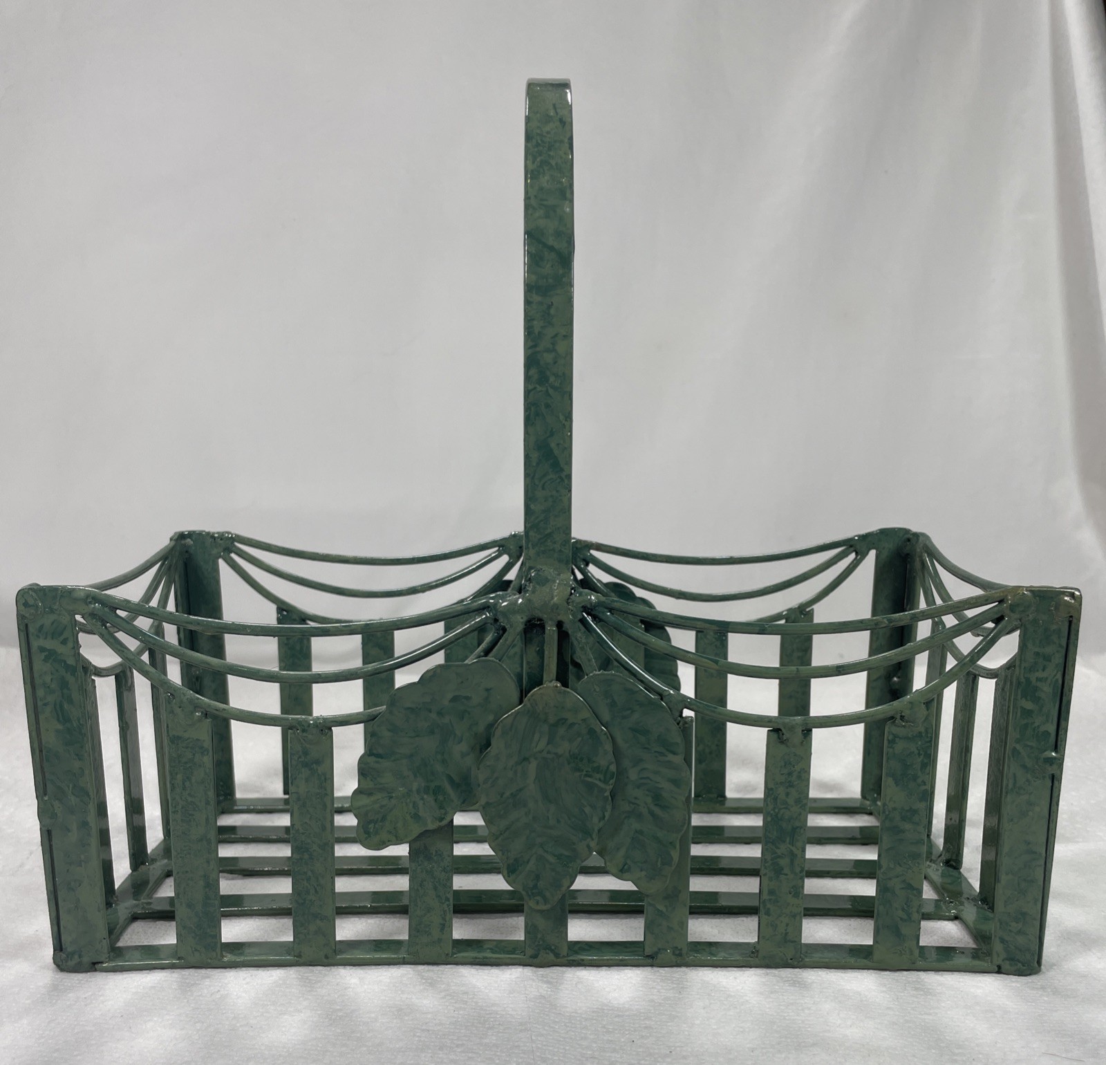 This product is a vintage decorative metal basket featuring intricate grape leaf designs. The basket stands at 9 inches tall and is rectangular in shape. It is crafted from light green metal with a country style, making it a charming addition to any home decor. Additionally, the basket comes with a handle for easy transport and display. Perfect for holding fruits or eggs in a unique and rustic way.