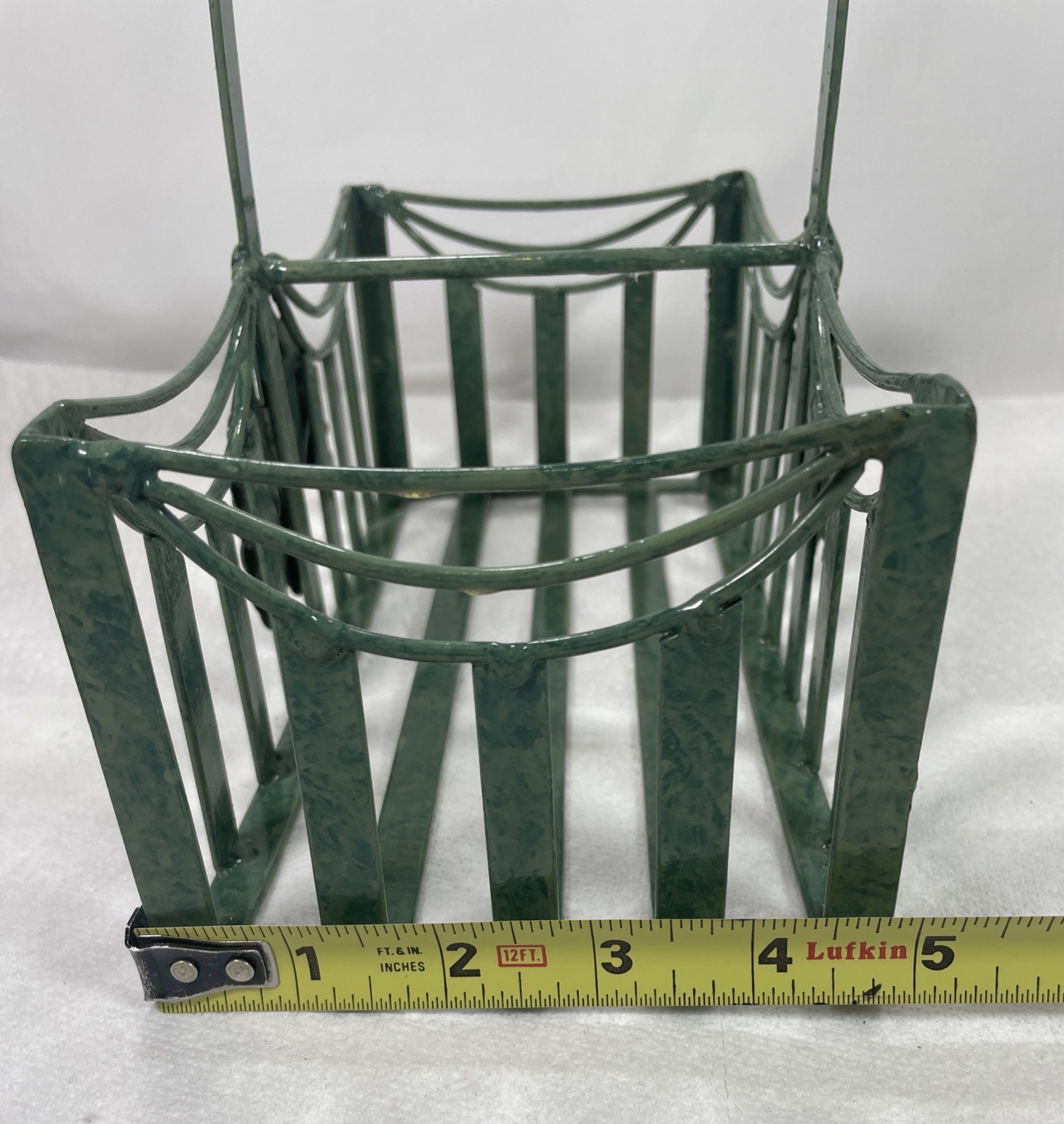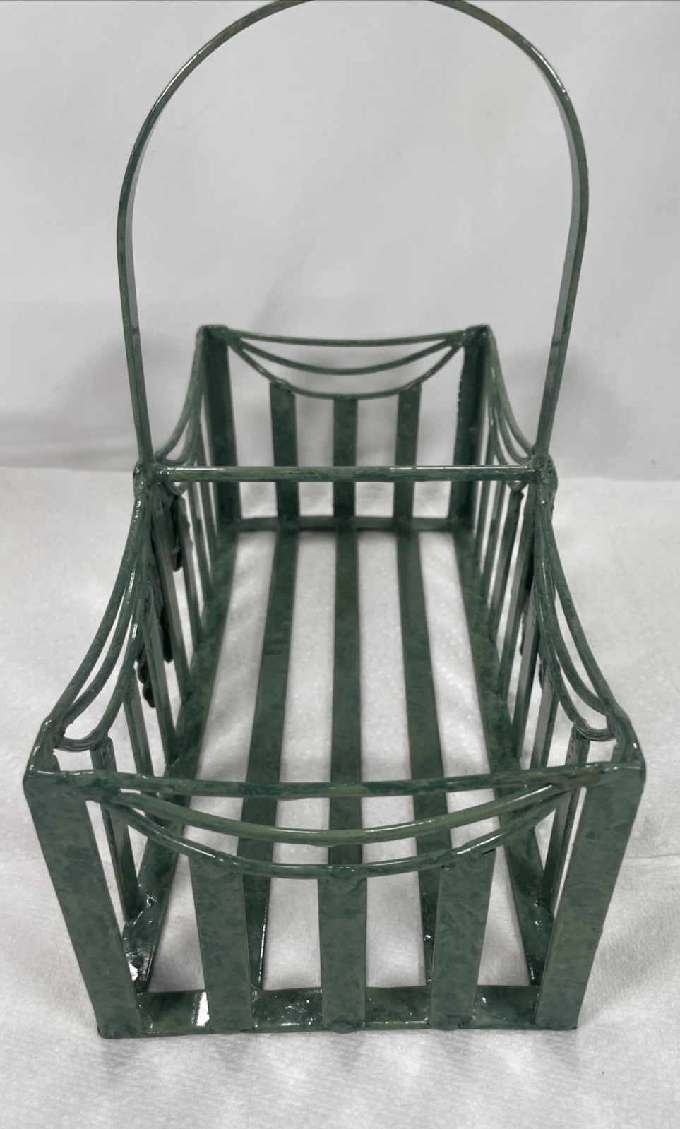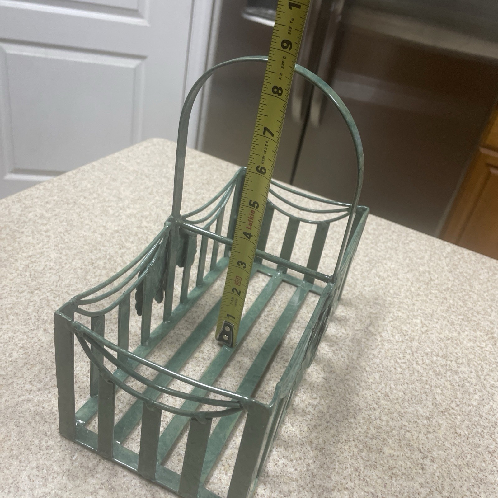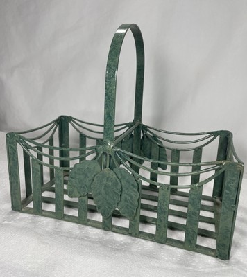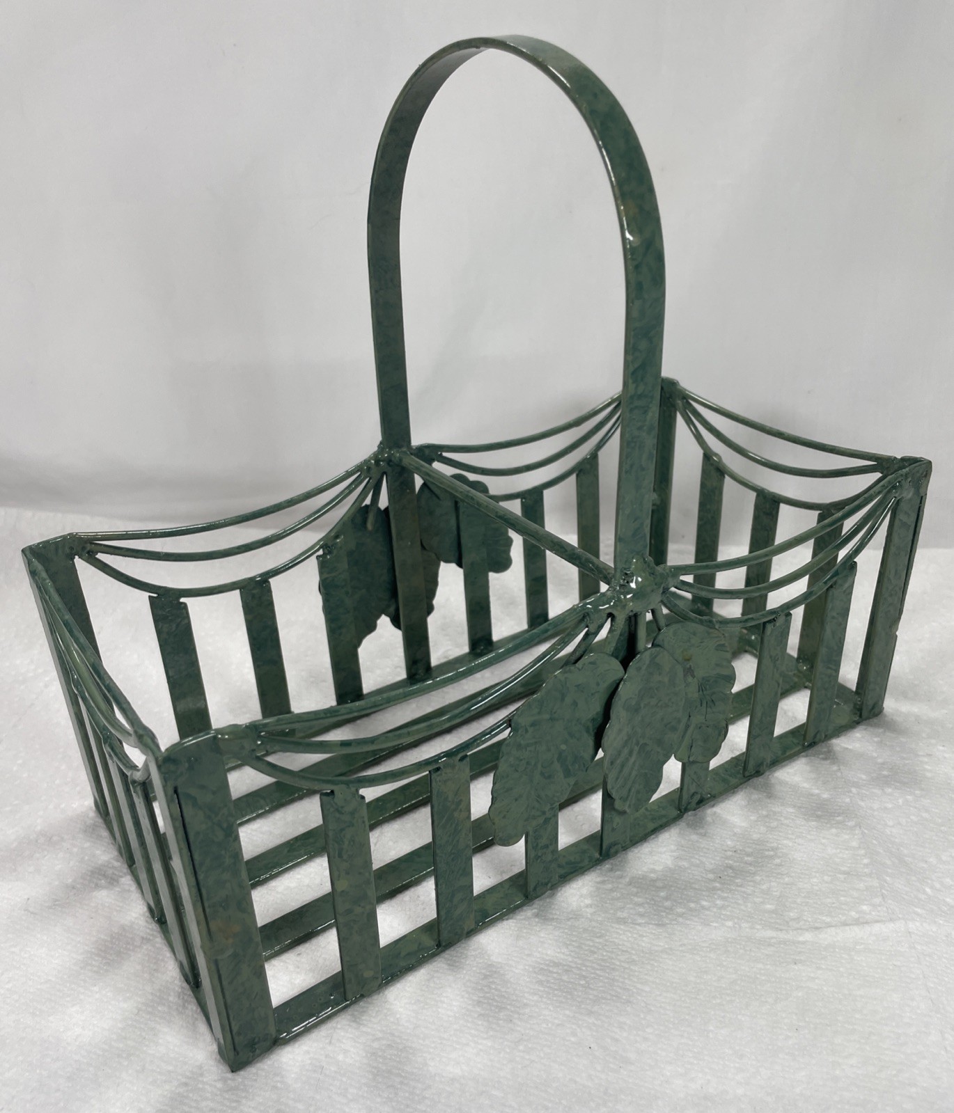 This product is a vintage decorative metal basket featuring intricate grape leaf designs. The basket stands at 9 inches tall and is rectangular in shape. It is crafted from light green metal with a country style, making it a charming addition to any home decor. Additionally, the basket comes with a handle for easy transport and display. Perfect for holding fruits or eggs in a unique and rustic way.