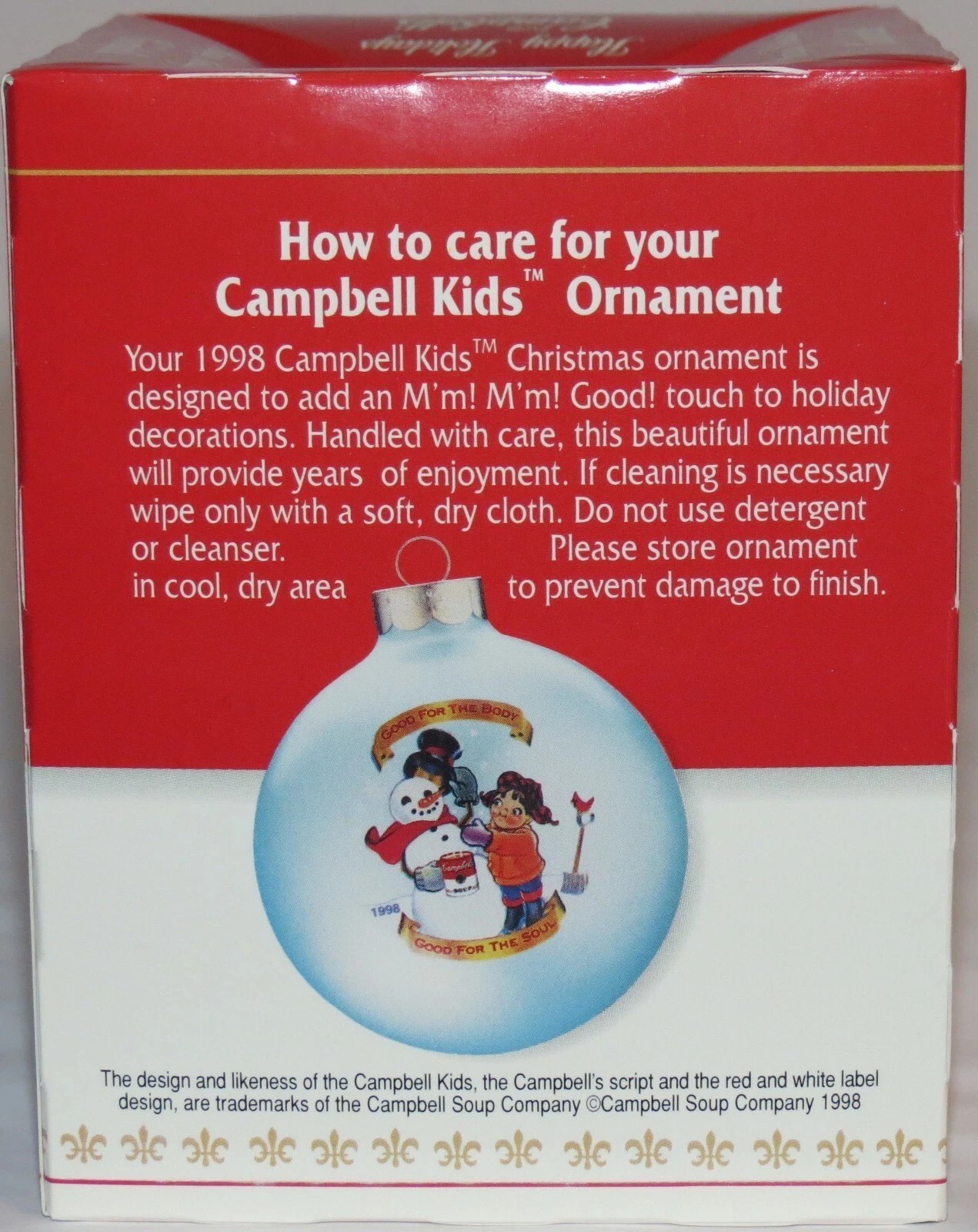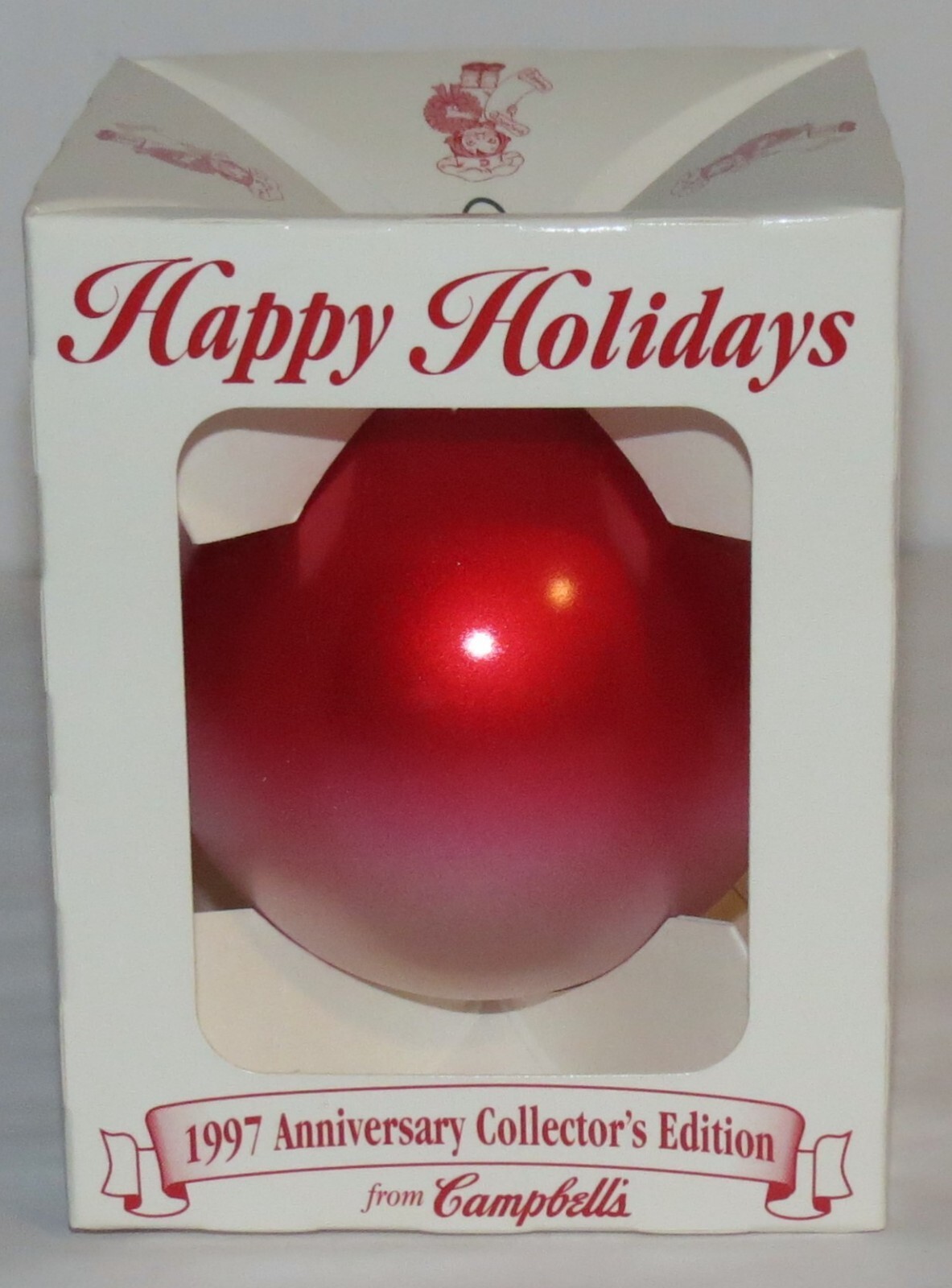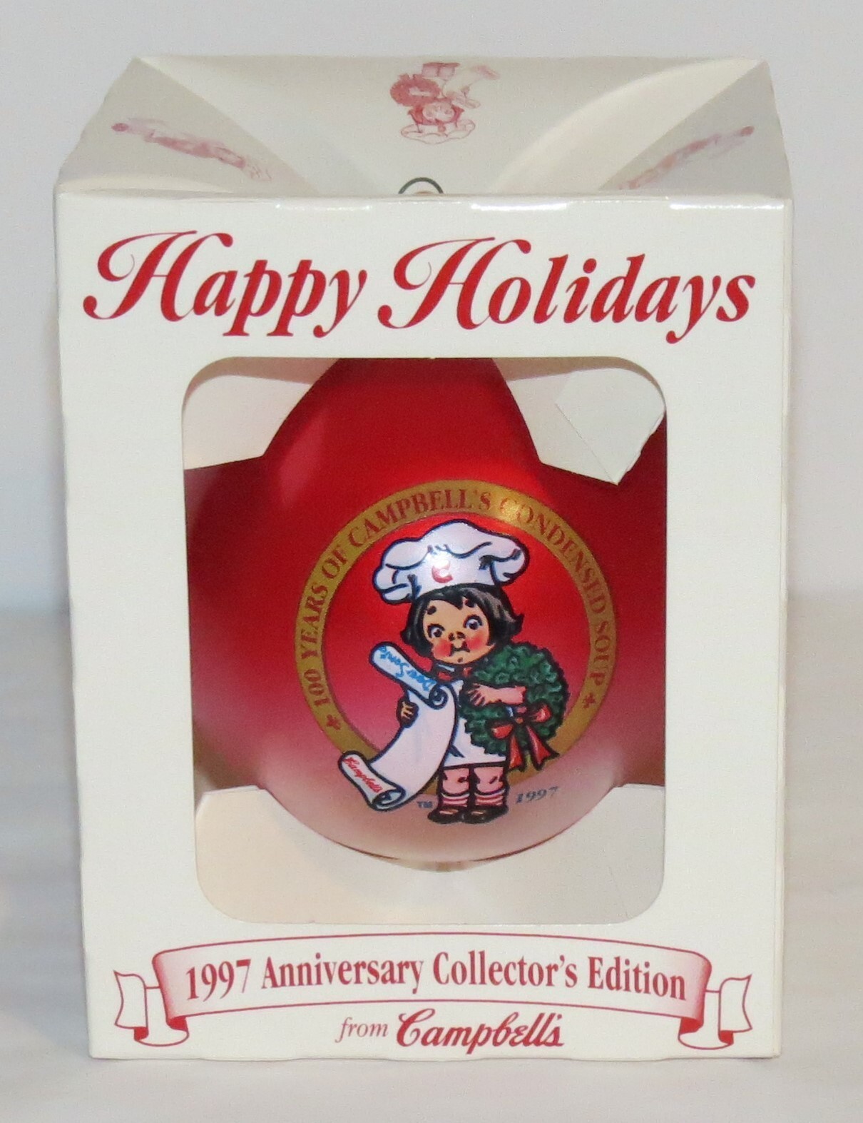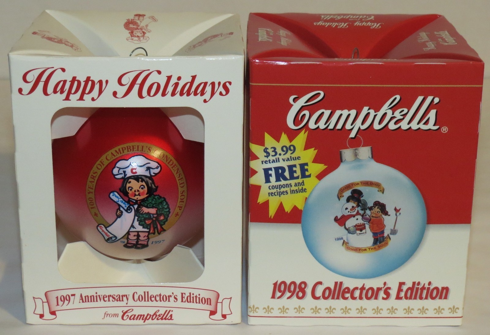 This is a set of two (1997 1998) Campbell's Collector's Edition ball globe glass ornaments in the original display boxes. The 1997 ornament celebrates the 100th