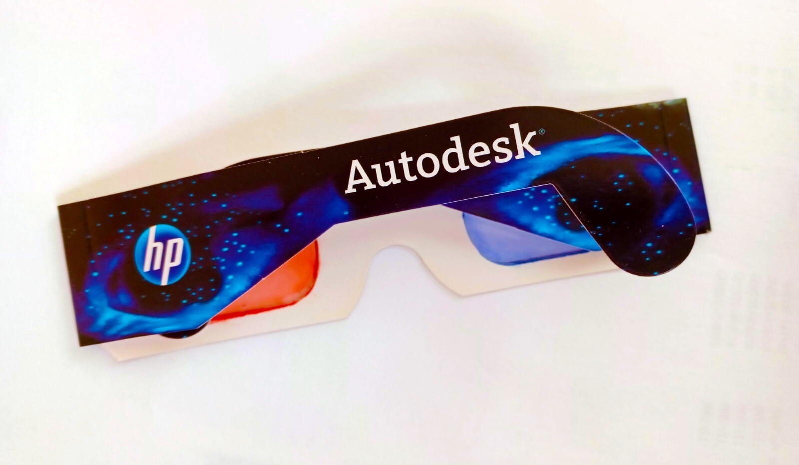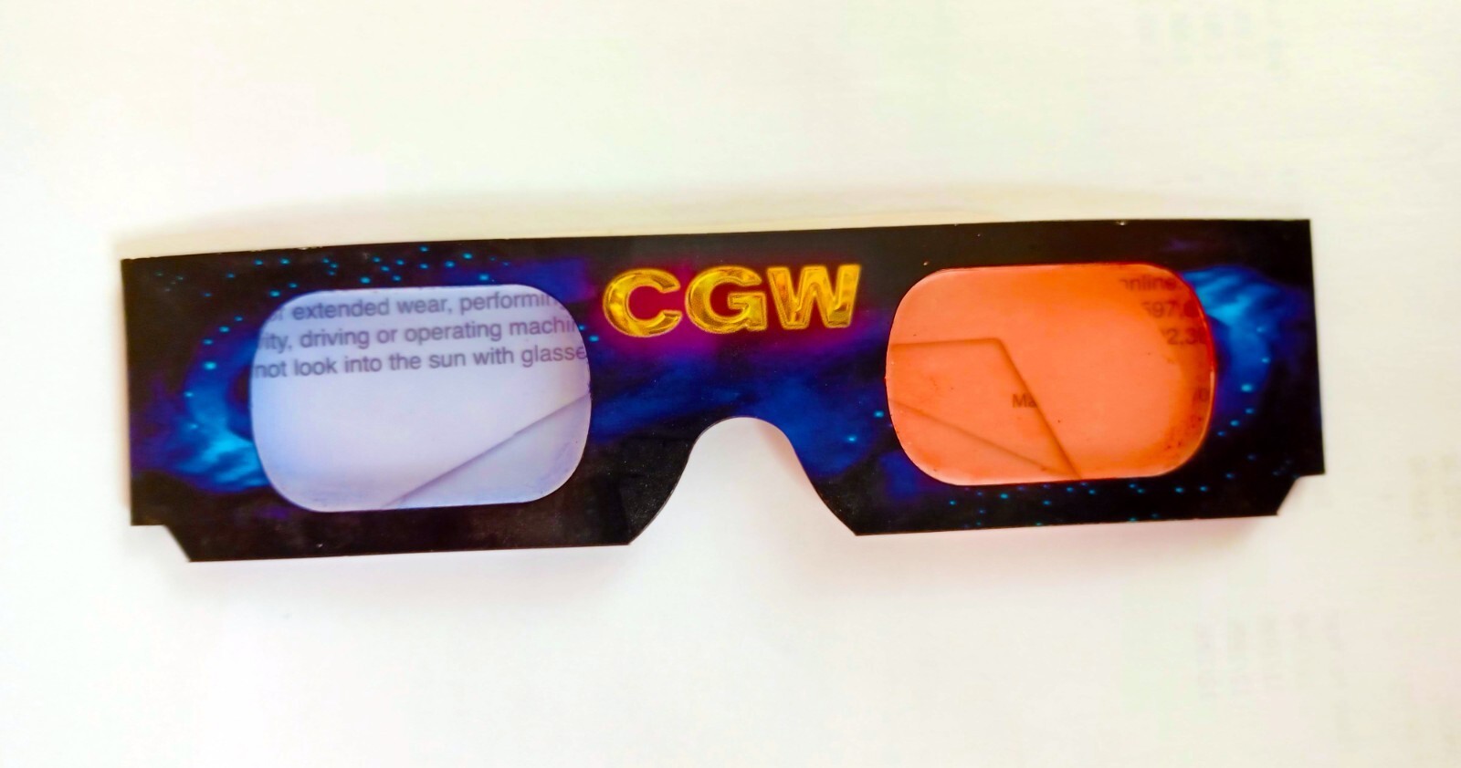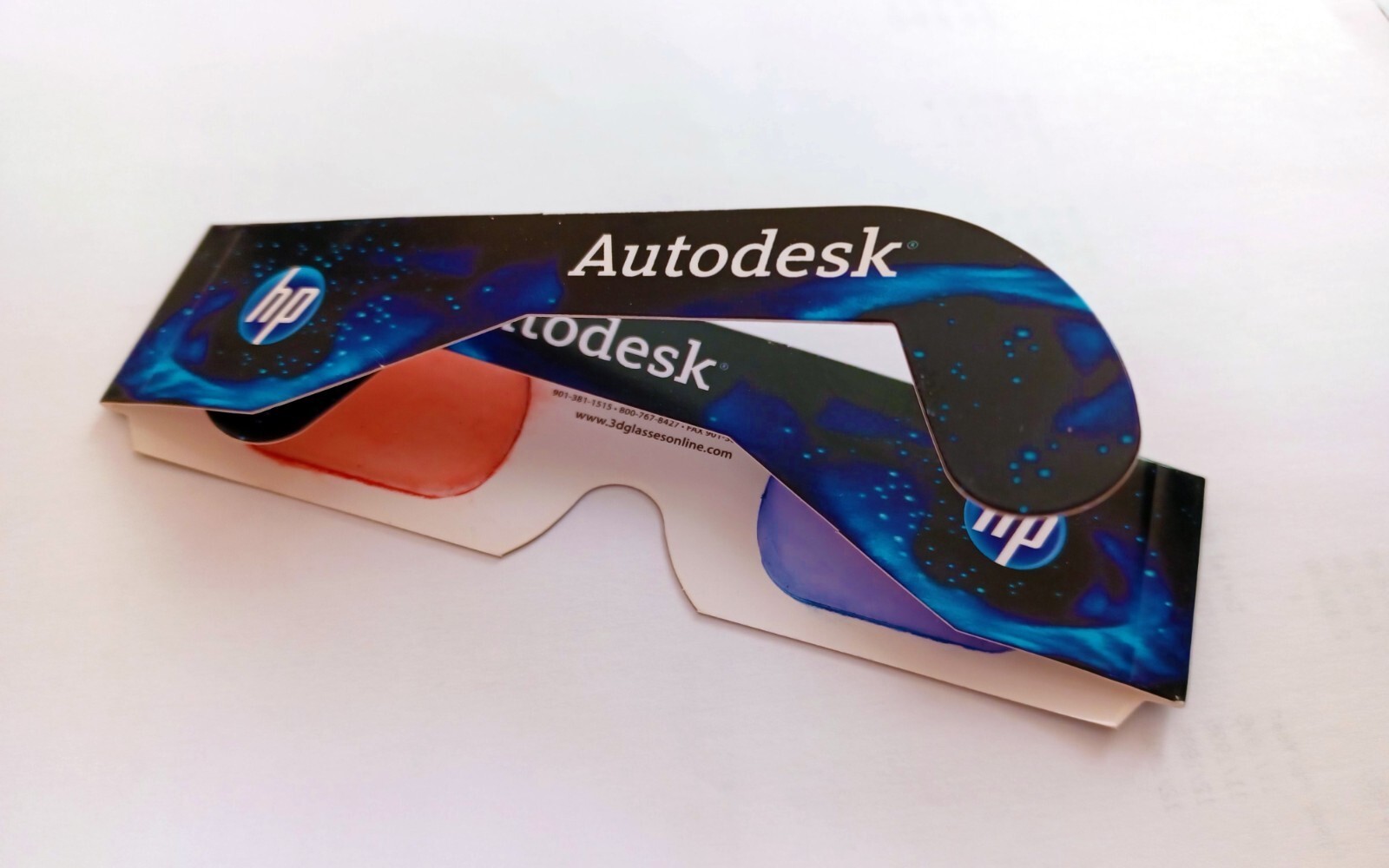 This pair of glasses are made out of paper board with blue and red lenses and the frame is a dark blue and black with the letters CGW for Computer Graphics World and has the words AutodDesk on the inside of the frame as these glasses came from Computer Graphics World Magazine and were sponsored by Autodesk, the company that makes 3D Software such as Maya, AutoCad and 3D Studio Max among other 3D Software Applications.