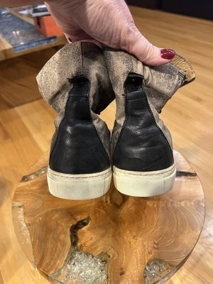 Men's high-top sneakers featuring a distressed leather look in black and beige tones.