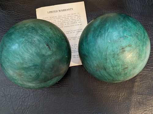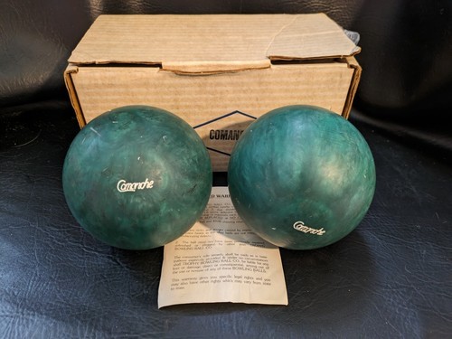 Ce lot de deux boules de bowling Duck Candle Pin de Trophy Comanche est parfait pour tout amateur de bowling vintage. Fabriquees aux Etats-Unis, ces boules sont un excellent ajout a toute collection. Pesant 3,9 oz, ils sont faciles a manipuler et ont une finition en caoutchouc vert nacre unique. Ces balles sont parfaites pour sports d?equipe ou tout simplement pour jouer au bowling entre amis. Ils sont en tres bon etat et prets a etre utilises aux fins prevues. Ne manquez pas l'occasion d'ajouter ces boules de bowling uniques et rares a votre collection.