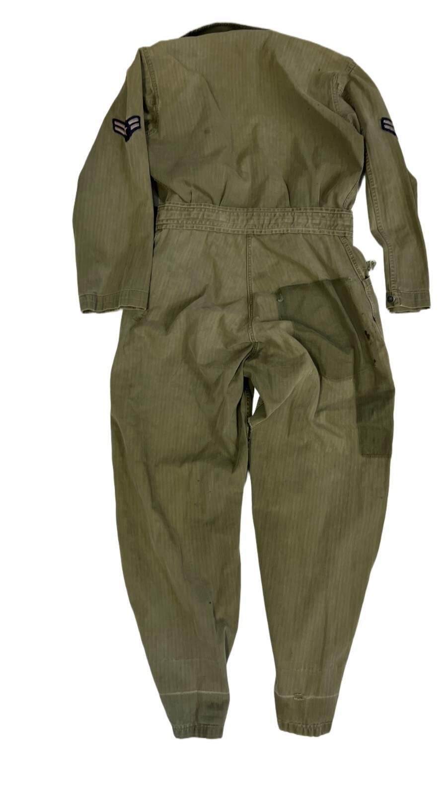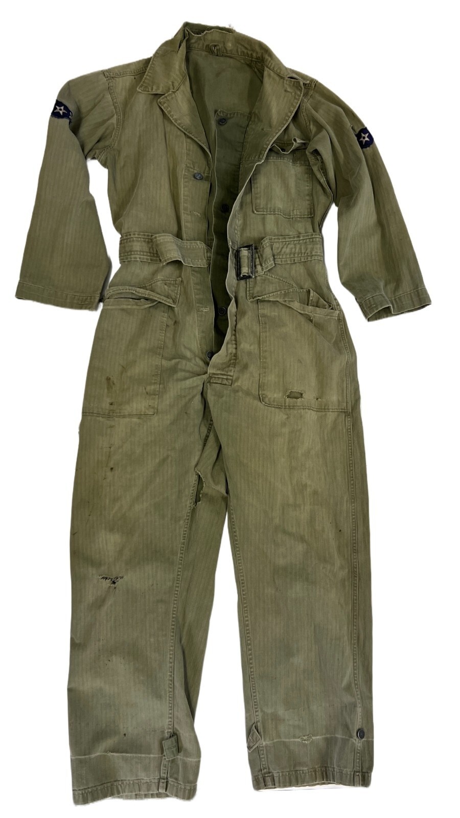 A true piece of WWII history ? vintage U.S. Army Herringbone Twill (HBT) coveralls with 13-star metal buttons and original 2-stripe patches on the shoulders. Features hem tabs at the ankles, button front, and classic one-piece construction.