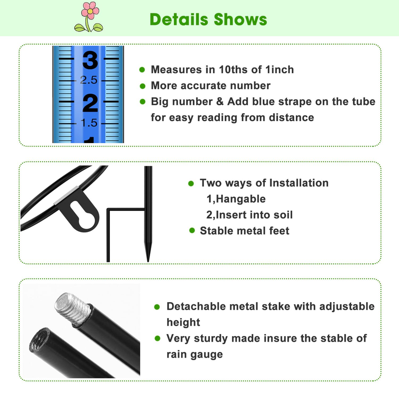 ???Easy to Install and Use? This rain gauge kit is easy to install, just connect the top bracket to the two metal poles and insert it into the ground.