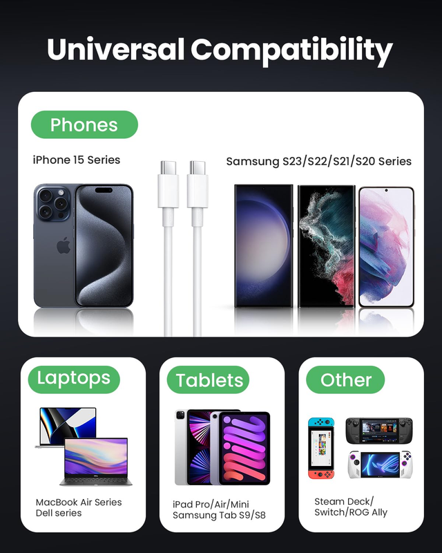Wide Compatibility: The usb c charger cable is compatible with iPhone 17 Air/17/17 Pro/17 Pro Max/16/16 Pro/16 Plus/16 Pro Max/15/15 Plus/15 Pro/15 Pro Max, MacBook Pro 2022, MacBook Air, iPad Pro/Air/mini, Samsung S25/S24/S23/S22/S21/S20 Series, Pixel, Switch, Steam Deck, ROG Ally and other devices with USB-C port