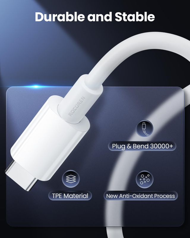 Soft and Durable: The Type-c cable is made of TPE Material, which is close to the skin to the touch and is soft and silky. Interface adopts a new and upgraded anti-oxidation process, which is more wear-resistant and lasts longer. It has undergone 30,000+ plugging tests, and it is not easy to loosen after long-term use