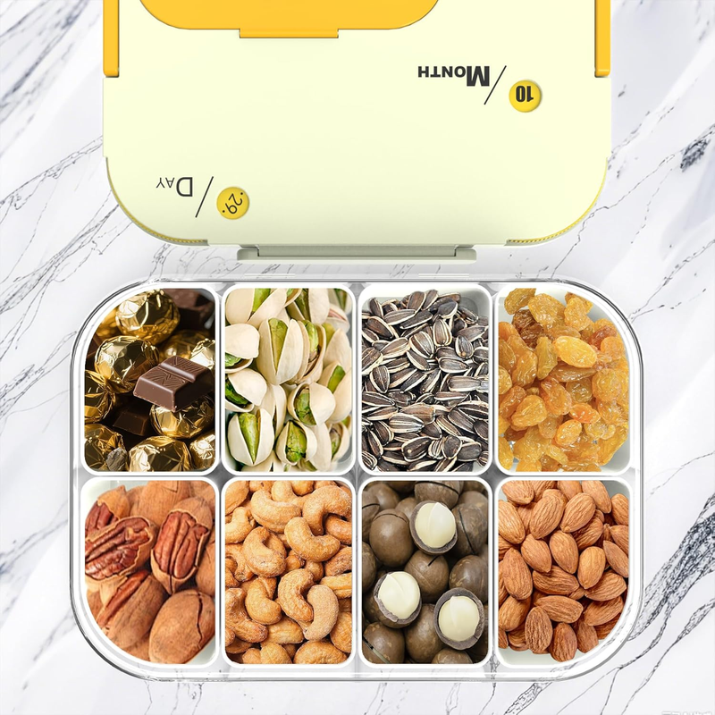 ?8 Compartments Snackle Box Container?The snackle box charcuterie container has 8 compartments, making it perfect for storing snacks, fruits, spices, nuts, and other snacks. You can store your food one by one to avoid mixing.Whether you're entertaining guests or enjoying a movie night, this versatile snack organizer keeps your favorite treats neatly arranged and easily accessible.