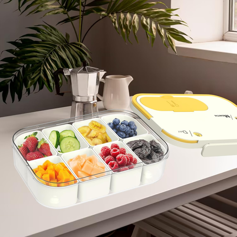 This divided serving tray with lid and handle contains 8 removable compartments, Every little compartments can be taken out.if you wants one thing and other wants something else, you can take the little compartments out.