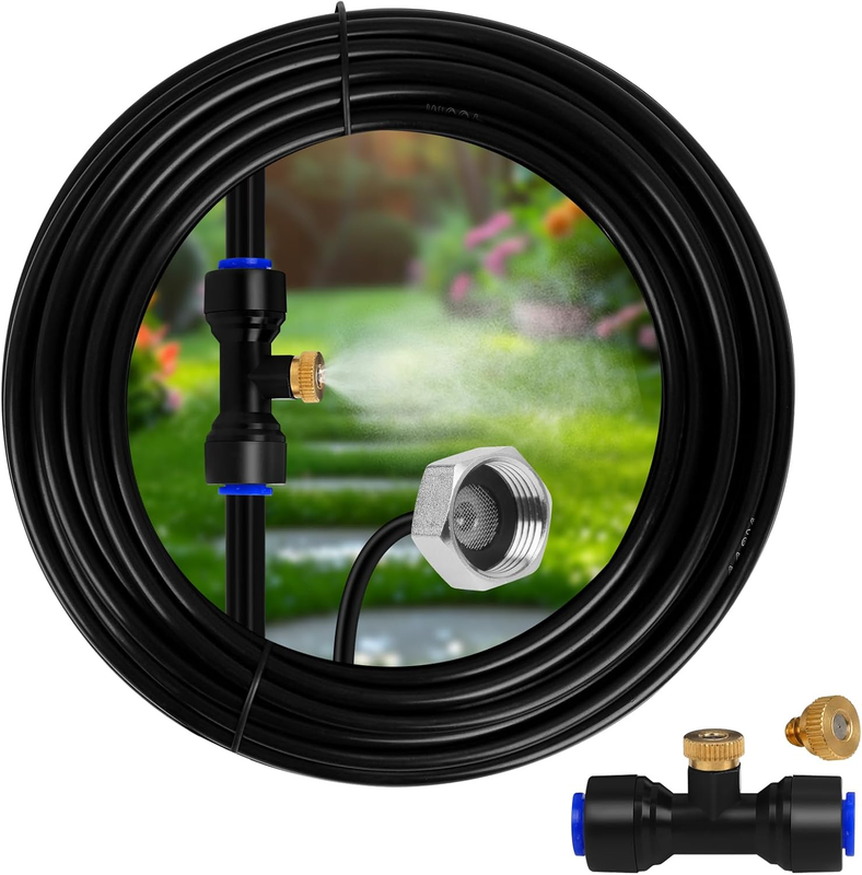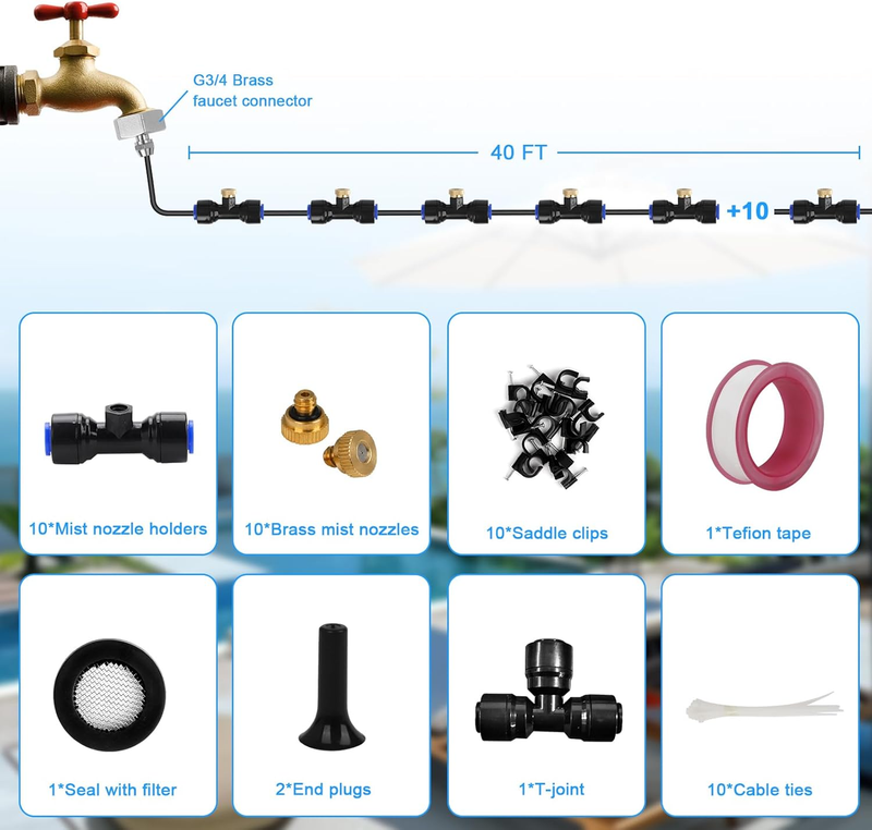 DIY Own Misting System: Compared to pre-installed mister systems, ours is purely DIY, which lets you enjoy the fun of DIY, and allows you to cut and install it as your desires! 40 Feet long PE cables, 10 brass nozzles and T-connectors, also comes with cable ties and saddle clips, Teflon tape and other accessories to meet your needs!