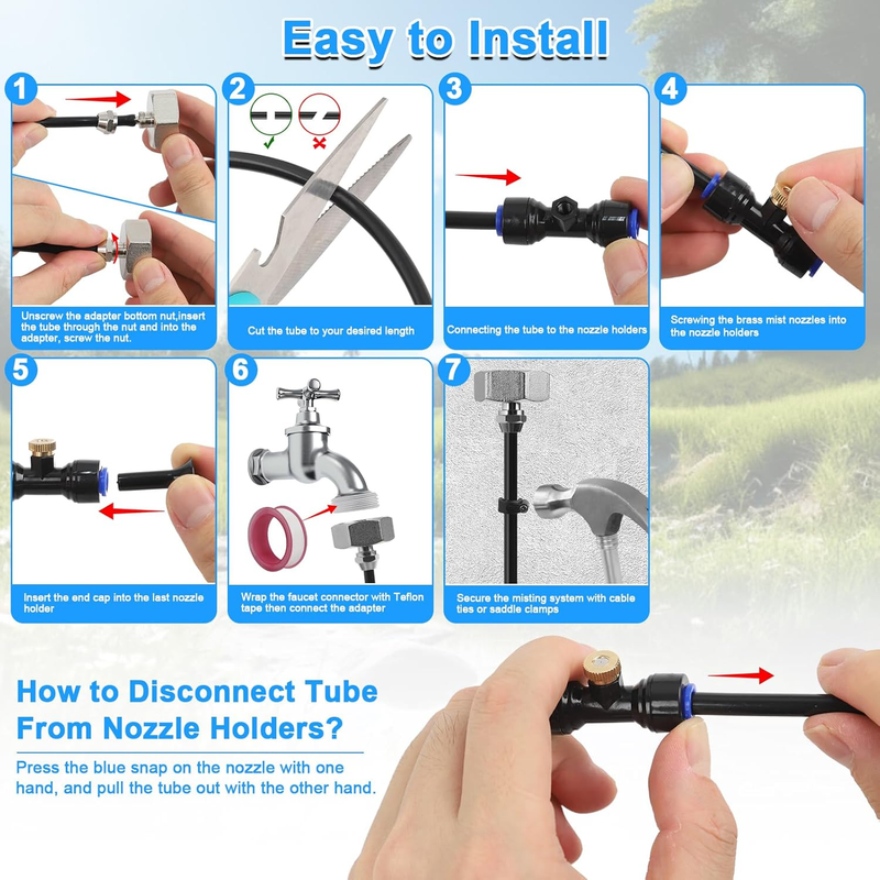 Easy to Install: No professional assistance is required to install the misting system, as you simply cut the lengh as your desire and plug in the connectors. Our pictures also show detailed installation instructions. To prevent water leakage, please wrap Teflon tape when linking the faucet. (If you have any questions please feel free to contact us)