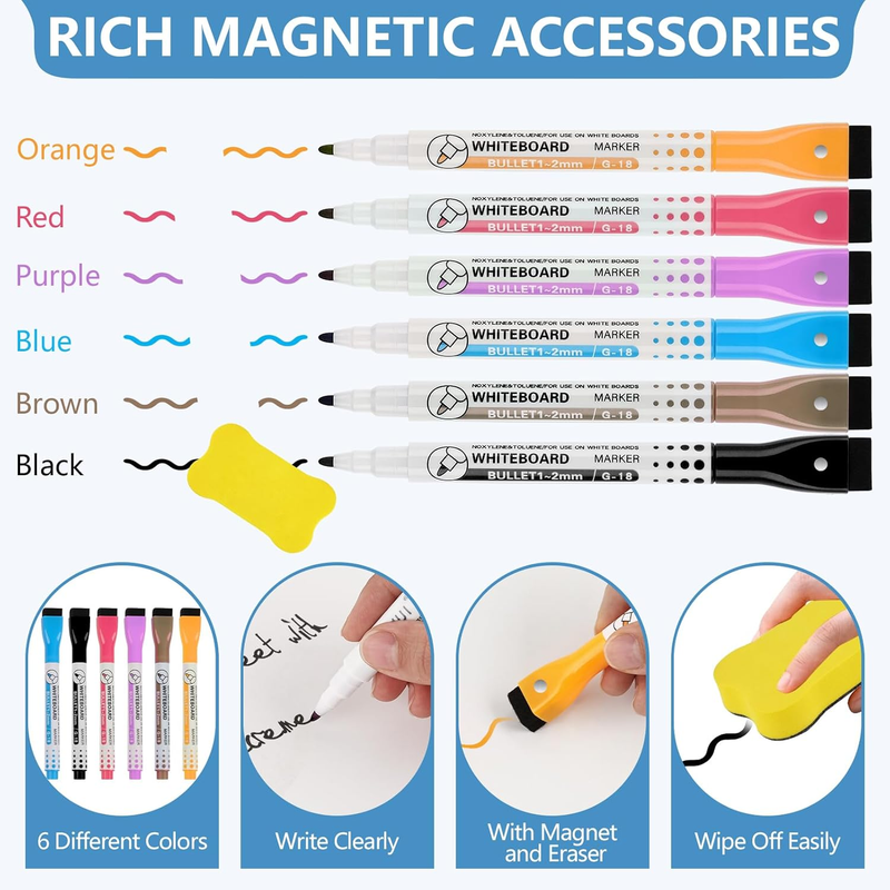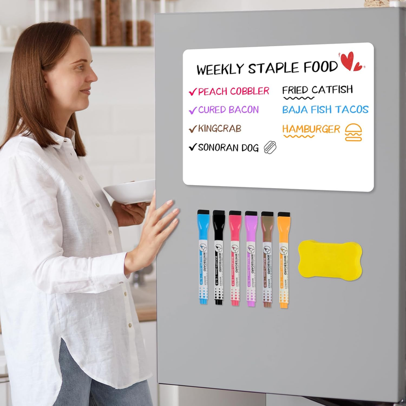 ?Magnetic Dry Erase Board?Package includes 3 pack 8'' x 12'' and 3 pack 5'' x 8'' magnetic whiteboard for fridge, 6 magnetic whiteboard maker pens of different colors, 1 pack magnetic whiteboard eraser. All of them are magnetic and can be directly attached to the refrigerator.