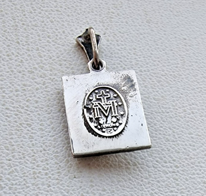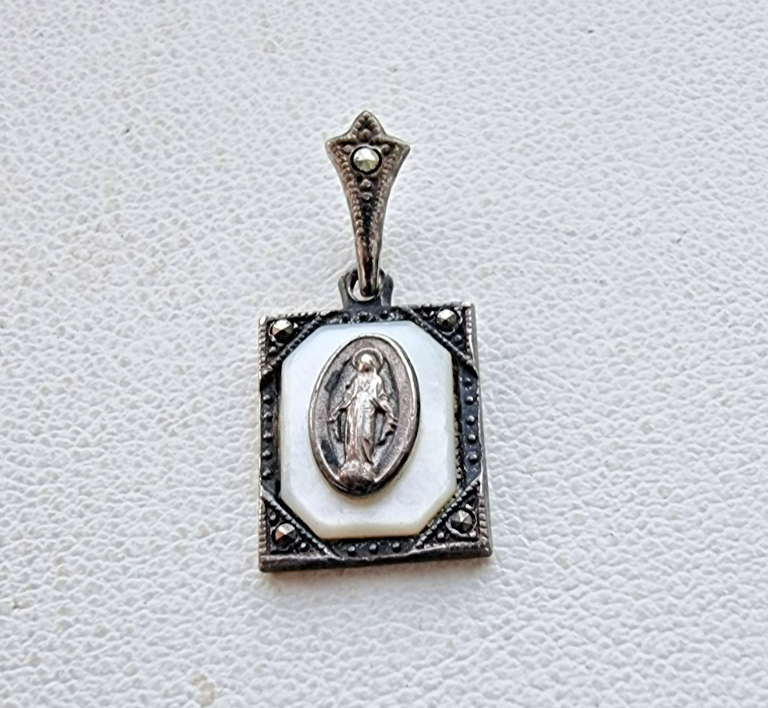 VINTAGE OXIDIZED 925 STERLING SILVER ABALONE AND MARCASITE VIRGIN MARY MEDAL