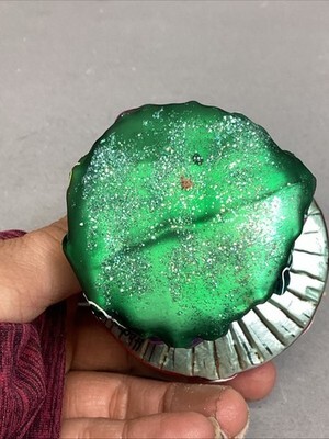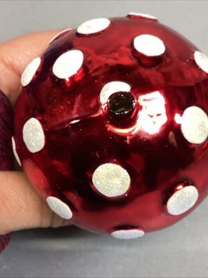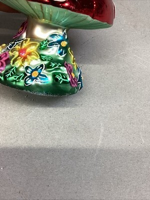 2002 Happy Springtime Glass Mushroom W/ Flowers Ornament- Missing Topper. In good condition overall except for the missing topper. No broken glass or any other damage. This ornament has a lot of glitter on it. It measures 3.25?Hx2.5?D