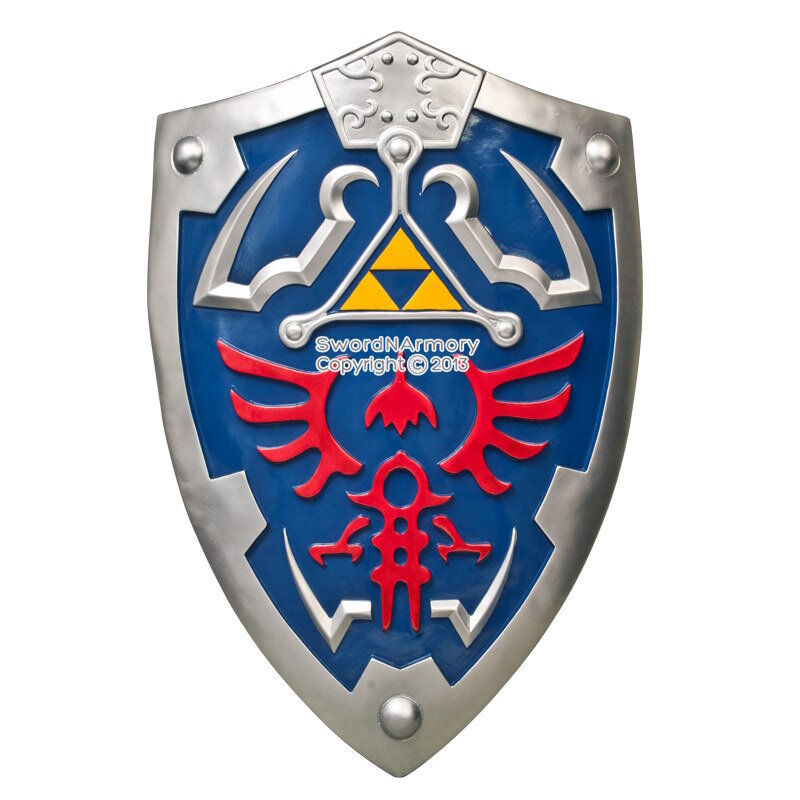 The Hylian Shield is a full sized poly resin/wood with the royal crest of the Hylian Royal Family, a red Phoenix. The Tri Force is located just above the Royal Crest. These attributes coupled with its resistance to fire attacks has made this shield the choice of Hylian Knights. It comes with a velcro strap to carry, and a chain to hang on the wall for display.