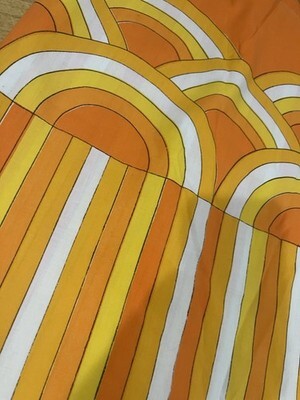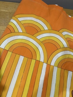 This vintage striped twin flat sheet by Burlington features a retro 70's design in yellow, orange, and white colors. Made from a cotton blend material, this rectangular flat sheet measures 98" in length and 72" in width, making it suitable for all seasons. Machine washable and featuring no closure, this unique piece is perfect for those looking to add a touch of retro charm to their bedroom decor, especially for fans of mid-century, groovy, and colorful styles.