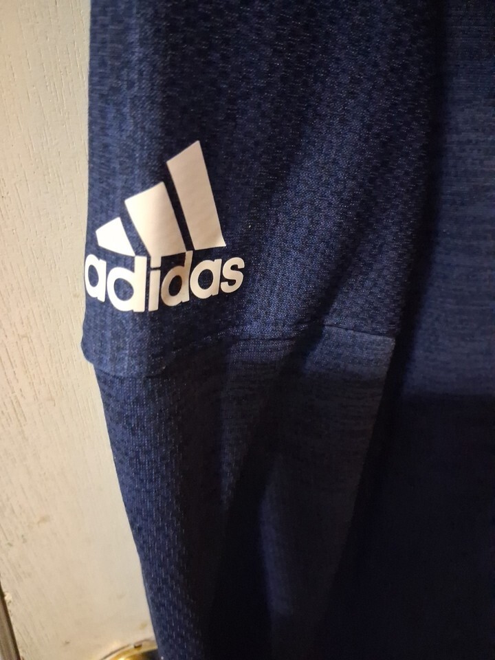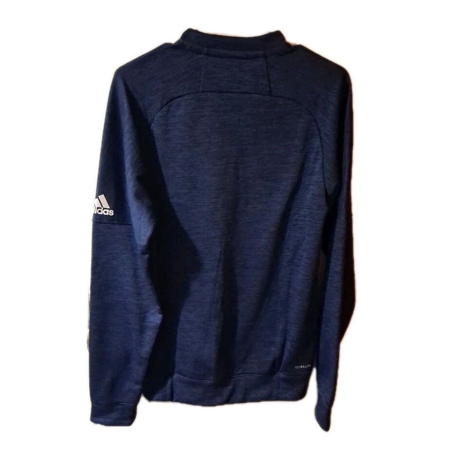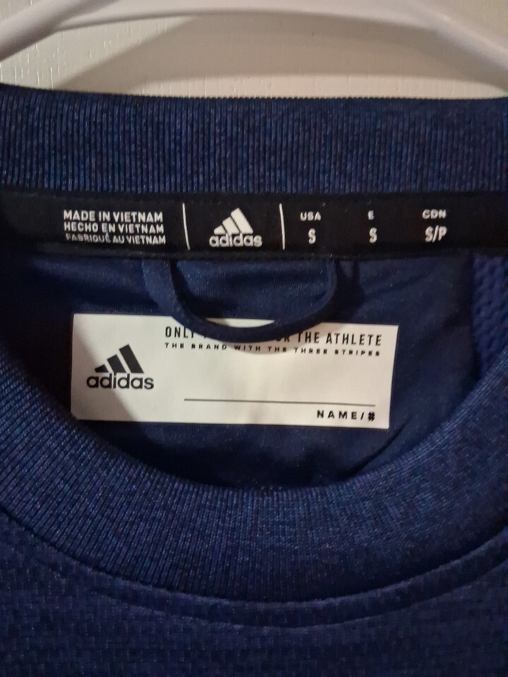 The product is a new Adidas Crew Neck Sweatshirt for men in size small. It features a solid blue color, long sleeves, a pullover closure, and is made of polyester fleece material. This sustainable sweatshirt is part of the Adidas Essentials product line and has a regular fit, perfect for casual occasions. The brand's reputation for quality and style is evident in this classic and versatile piece of activewear.