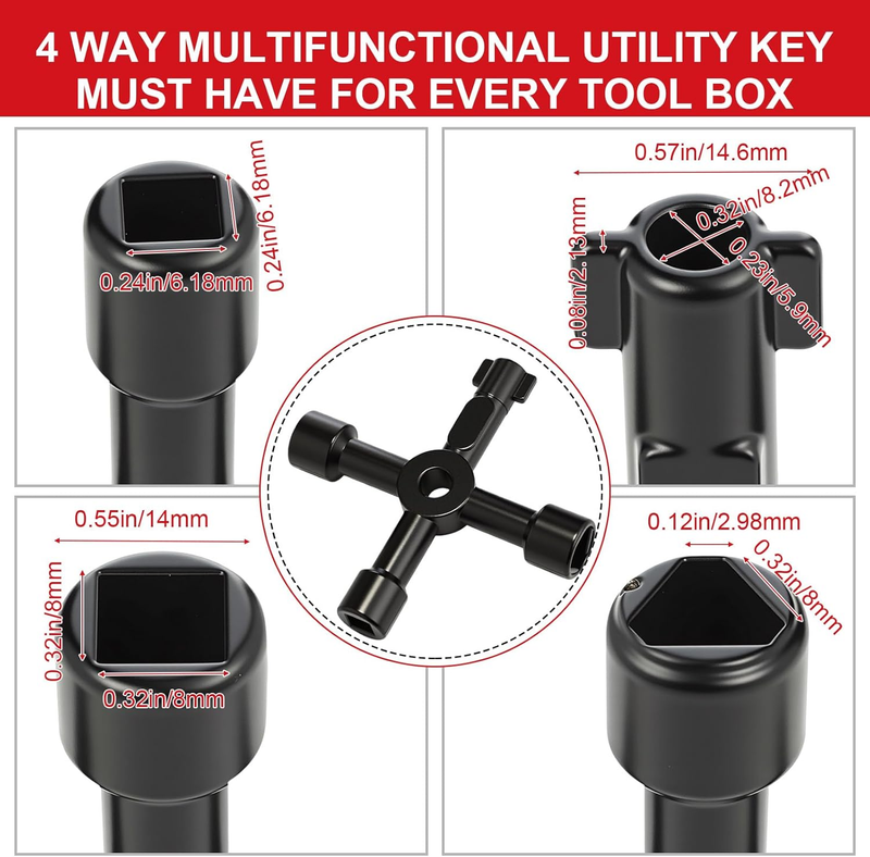 Come with 4-way Multi-functional Utility Key: the 4-way versatile chuck key is made from stainless steel, 4 Way Utility Key include 2 square water meter keys, 1 triangular water meter key and 1 key shaped gas meter key, suitable for opening many boxes and valves for electricity, water, gas, trains, cabinets, elevators, etc.; It comes with a raw material tape to enhance the sealing of pipe joints