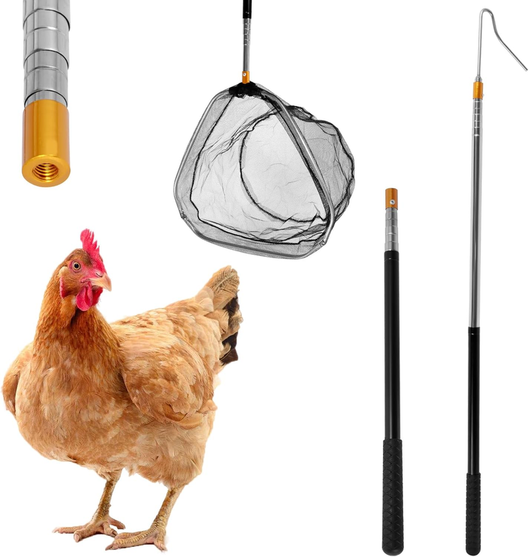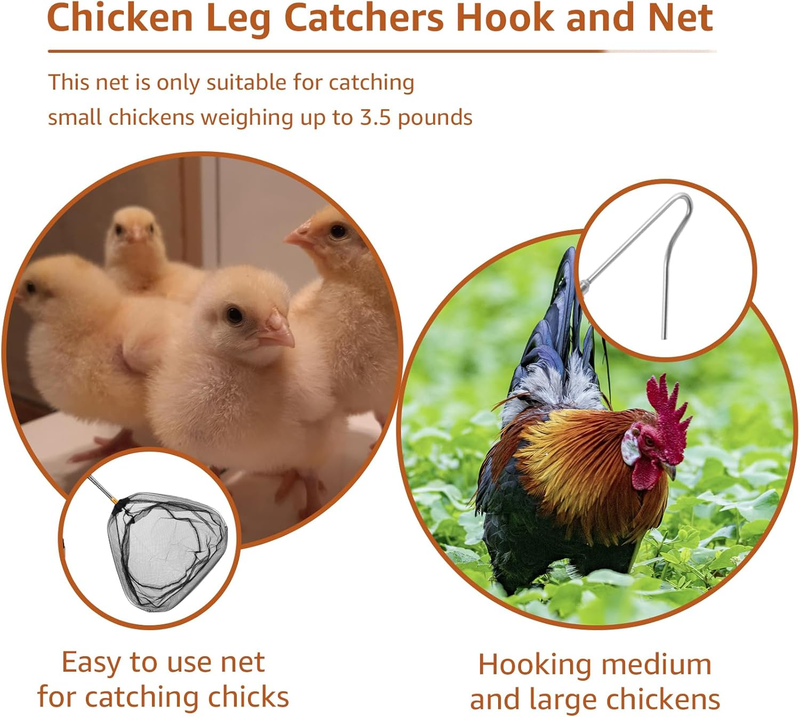 This chicken catcher set comes with 1 hook head, 1 triangular net and 2 telescopic poles, suitable to help you catch poultry of different sizes. Among them, the net is suitable for catching 3.5 lbs small chickens, if you need to catch large chickens you can use the catcher with hook head.