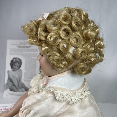 The VTG Danbury Mint "Little Miss Shirley" Temple Doll is a vintage collectible porcelain doll featuring the iconic character Shirley Temple. With blonde hair and brown eyes, this 11-inch doll comes in its original box and is a part of the Collector Edition series by Danbury Mint. Perfect for all occasions, this girl doll is a must-have for collectors of vintage dolls and fans of Shirley Temple.