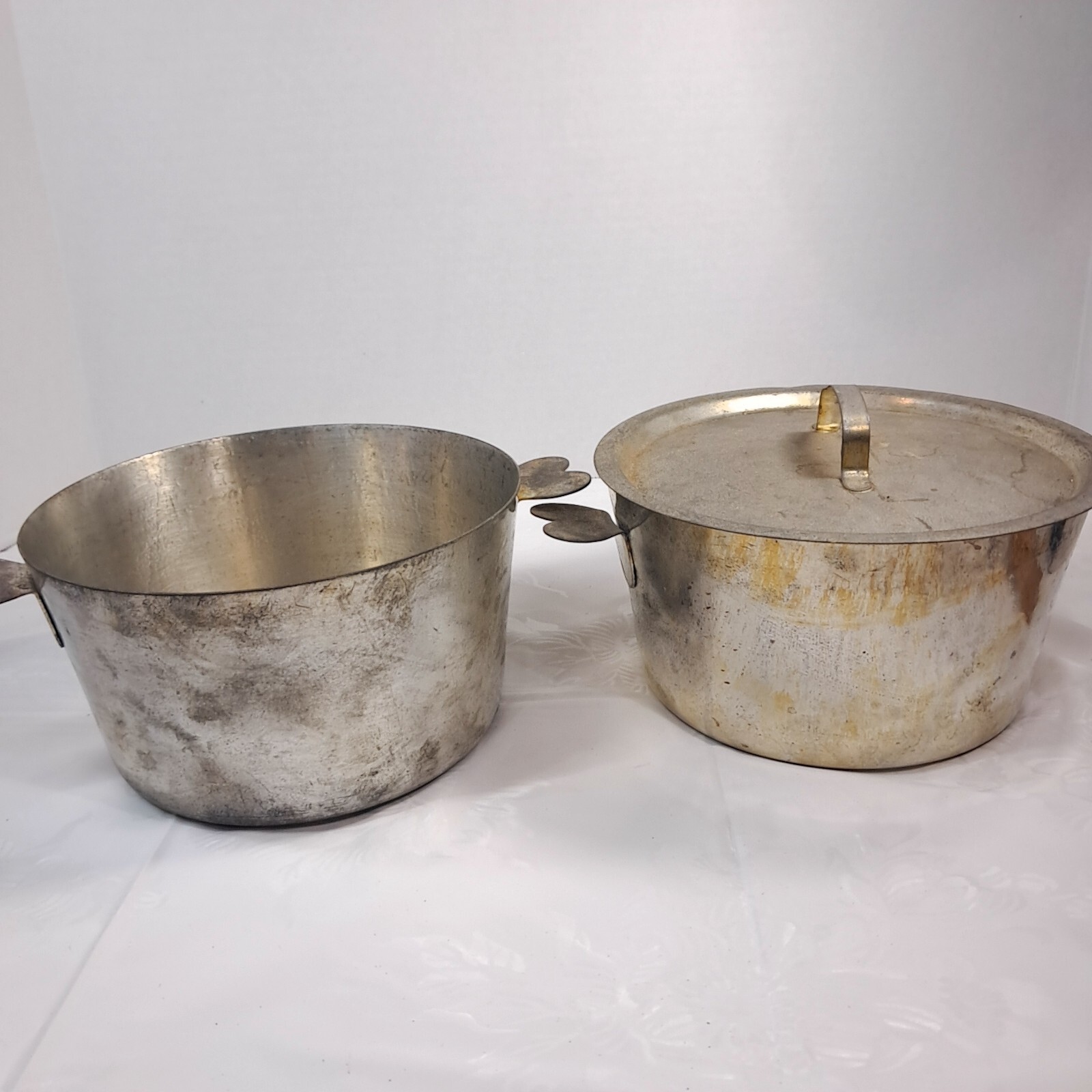 Includes 2 pots and 1 lid. Rustic style. Wear/marks/discolorations as shown.