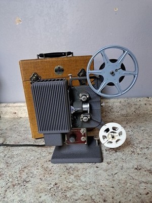 An 8mm movie projector, on the side is a maker's plate with a Motor Switch and a Lamp Switch. In the center is a speed control knob. The empty take-up spindle is placed on the lower take-up spindle. The film reel is placed on the upper spindle and then threaded through the slot between the lens and the lamp onto the lower reel. There is an elevation knob on the front of the projector to adjust or lower the height for viewing. The lens has a pin which enables the operator to focus the projector. The 500-watt lamp has its own cover and is housed in a special metal cover with fins for heat dissipation. 100-125 volts, 600 watts, for use with slow burning film only. 500 watt lamp maximum. Serial number ?. A long Black-colored power cord emerges from the back of the projector and terminates in a 2-pin plug.