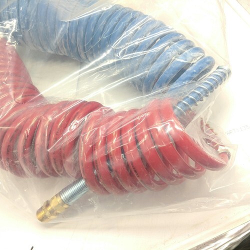 Brass Handle Aircoils feature color-coded (red - emergency / blue - service) hoses with DOT brass fittings. Excellent coil memory and durability. Brass handles on trailer leads provide tubing protection during gladhand connections. Heavy gauge plated spring guards. Spring guards closed coils extend well past 2" from fitting, exceeding DOT regulations. Inner tubing assemblies meet DOT FMVSS - (49 CFR 571.106 49 CFR 393.45). Resistant to gasoline, diesel fuel, methyl-alcohol and zinc chloride.