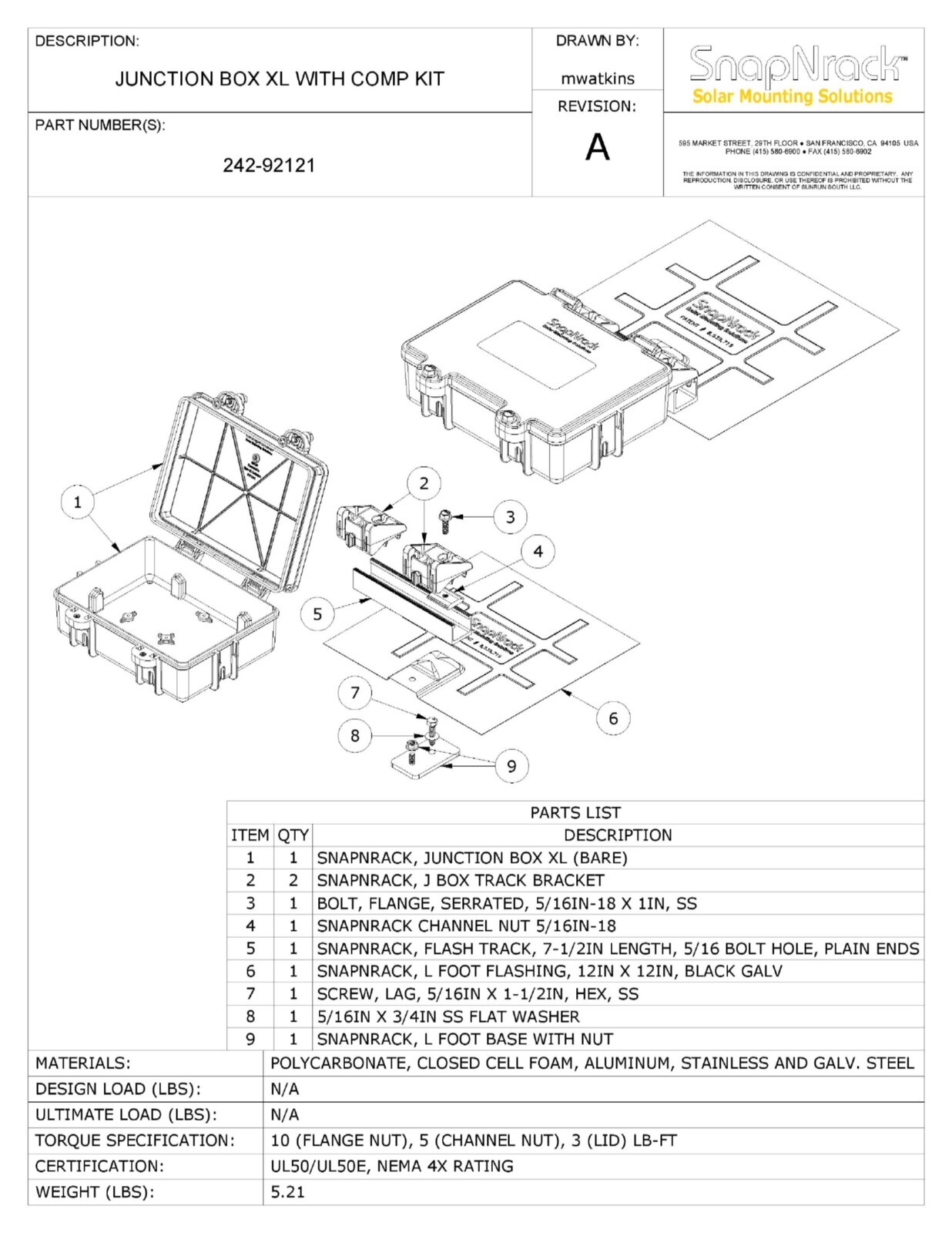 SnapNrack 242-92121 Solar Wiring Junction Box XL with Comp Kit NEMA 4X Qty 1