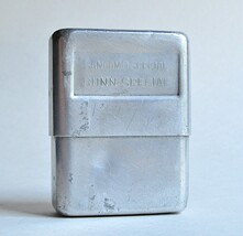 Antique aluminum tin for an Illinois Watch Company pocket watch, used to pack their Sangamo Special and Bunn Special watches. Measures 3 1/6" x 2 3/8" x 1 3/32". Condition is rough: lots of dents and abrasions, and someone has scratched a date and initials (WS, I think) on it in three places. My guess is that Dad (or Grandpa, Uncle, etc) got a new watch and little W. S. was given the box to play with. I've taken lots of pictures from every angle, showing at least two views of each side so that you can assess the damage for yourself. I gave it a light cleaning; some of the marks may come off if you go at it with metal polish.